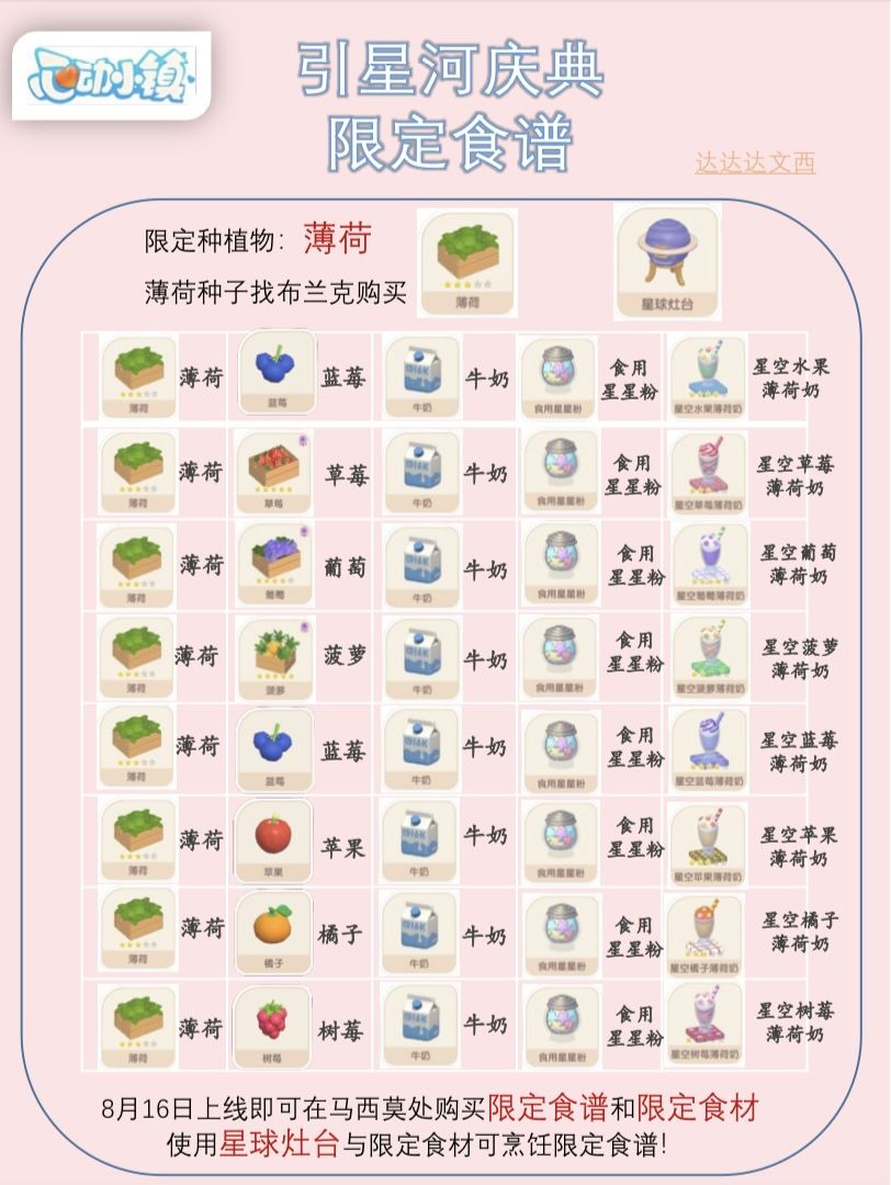 心动小镇引星河庆典烹饪合成配方 新增配方在马西莫购买,新增两个材料食用星星粉,发酵面团建议第一天拉满。 星空水果薄荷奶扩展水果替换:苹果,橘子,蓝莓,树莓,草莓,葡萄,菠萝 星空水果甜甜圈扩展水果替换:苹果,橘子,蓝莓,树莓,草莓,葡萄,菠萝 翡翠海蜇塔塔扩展水果替换:翡翠紫星海蜇塔塔使用两个紫光海蜇,翡翠蓝星海蜇塔塔使用两个蓝光海蜇,翡翠绿星海蜇塔塔使用两个绿光海蜇 星空餐点组合没有扩展配方 求