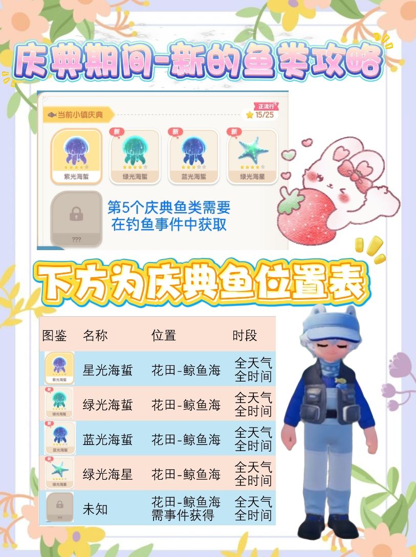 庆典期间-新虫位置 1.蓝光萤火虫,位置在渔村-渔村广场 2.绿光萤火虫,位置在森林-灵橡松林 3.紫光萤火虫,位置在花田-风车花田 4.粉光萤火虫,位置在温泉山-温泉附近 分布范围广,可能比较难找~[表情_捂脸哭] 总之得带上充气蜜蜂和强化剂捕虫吧 庆典期间-新鱼位置 一共有5种庆典新鱼 钓鱼地点:花田-鲸鱼海那边 记得带上足够的鱼尾和喷雾再来钓鱼 配合彩虹花buff30分钟概率加星会更快出5星