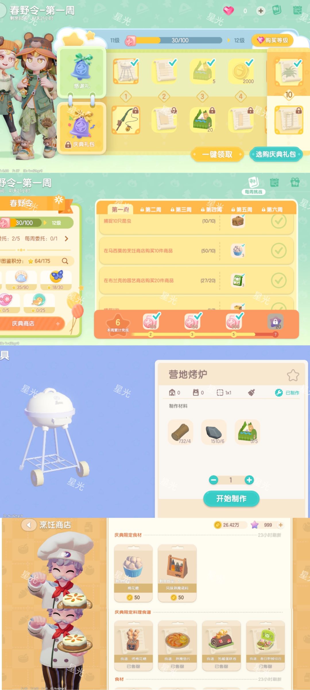 补充一下,还有一个是烤草莓棉花糖得食谱 首先先去找马西莫买限定食材(棉花糖和熟腌调料),记得要先去买这4个初始的限定菜谱才行(这次也是不能使用自家的灶台制作,需要注意)需要自己制作营地烤炉,手册0级可制作 营地烤炉材料:珍稀木材*4+矿石*6+限定材料包*5 然后接下来可以开始制作18个限定菜谱 首先要先制作烤棉花糖,之后才能制作以下7种口味棉花糖(需要前置棉花糖制作才能解锁新的口味棉花糖) 熟腌