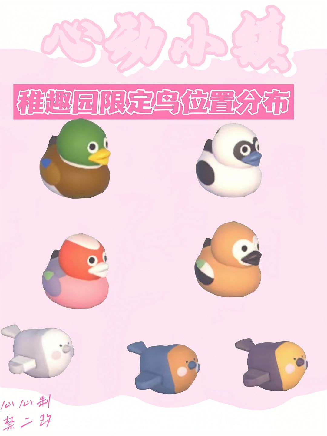 #心动小镇 #小镇稚趣园攻略征集 #心动小镇创作计划 发条小灰雀-温泉山-石岸崖 发条小棕雀-温泉山-火山湖 发条小蓝雀-温泉山-遗迹 充气绿头鸭-城郊湖 充气白沙秋鸭-温泉山-火山湖 充气赤颈鸭-森林湖 充气赤麻鸭-草原湖