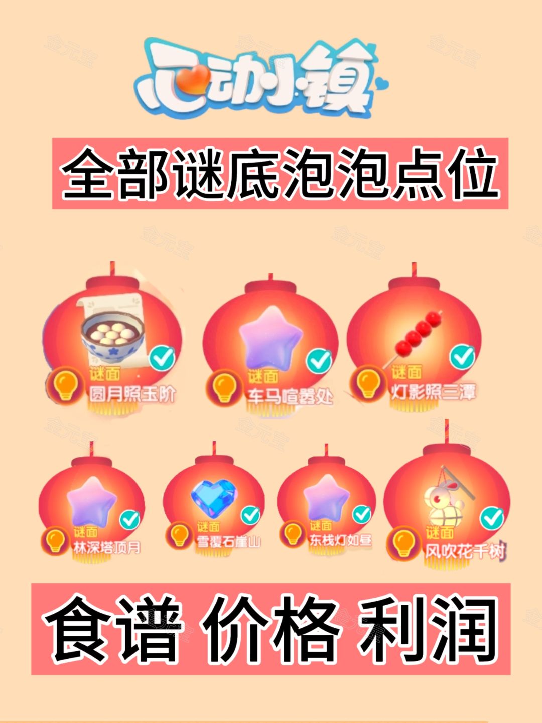屏幕上地球→活动→灯彩结良宵 ,先点开谜题 1.圆月照玉阶(豆沙汤圆食谱) 泡泡在阿塔拉的市政厅正面 2.车马喧嚣处(满愿星) 泡泡在安德鲁旁边路牌 3.灯影照三潭(糖葫芦) 泡泡在9号家园旁边路牌 4.林深塔顶月(满愿星) 森林的小鹿塔上面 5.雪覆石崖山(月光水晶) 温泉山的亭子里 6.东栈灯如昼(满愿星)渔村东栈的伞上。从椅子跳伞上再跳屋顶,从屋顶跳向泡泡 7.风吹花千树(兔子灯笼) 泡泡围