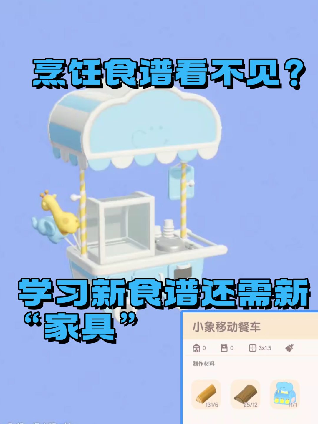 [表情_捂脸哭][表情_捂脸哭] 稚趣园的新活动 有烹饪新食谱,一共6个,我可能不是很了解,原来活动食谱需要配合活动烹饪道具 我还纳闷是不是我家的三个炉子都不支持做新菜,我又跑到“马西莫”那里用他的,发现也不行,是bug? 本来放弃了准备去做钓鱼活动,还得是热心肠大佬提了一嘴,果然……我也不知道啥时候有的图纸,总之就是可以做这个“小象餐车”了 太好了!6个菜单总算出来了,烹饪启动! [心动小镇_难过]