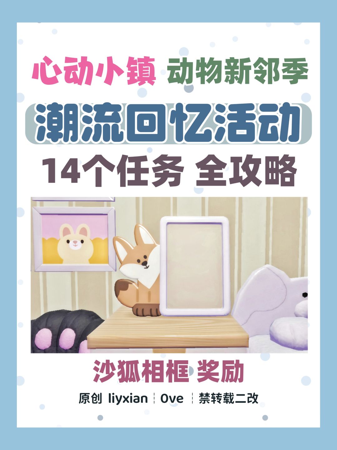 本周开启【潮流回忆】活动,活动共14个任务,全部潮流回忆任务完成后,可以获得【沙狐相框】奖励。 ① 阿塔拉【动物新邻纪念】任务:图2(奖励:5个动物爪爪材料包) ② 14个潮流回忆任务攻略:图3-9(奖励:沙狐相框) #心动小镇 #小马宝莉心动小镇周年联动 #动物新邻季攻略征集 #心动小镇攻略 #心动小镇日常 #心动小镇1周年庆