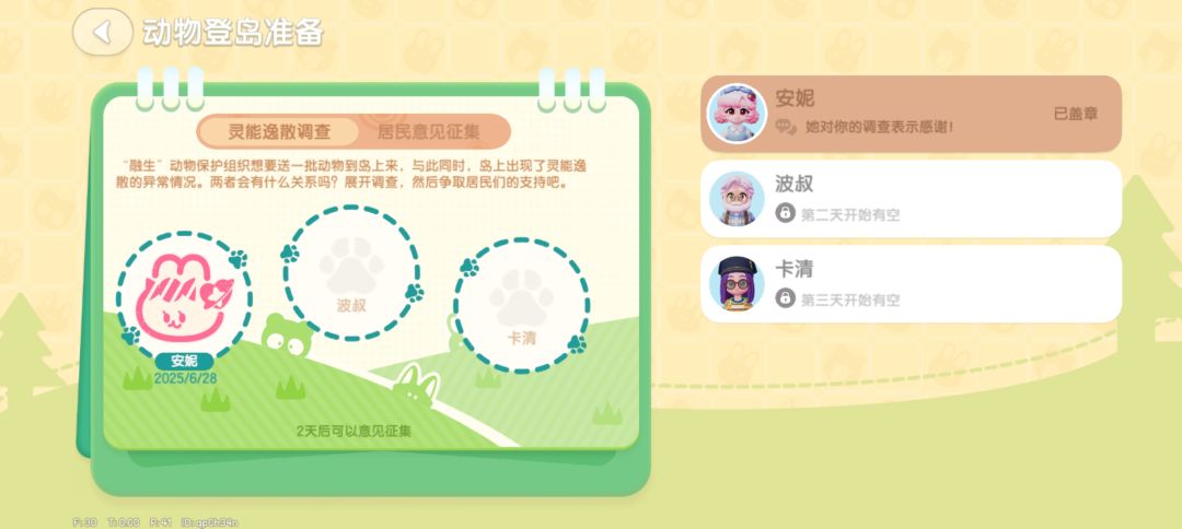 1、【动物新邻季 筹备期】: 发展家等级达到7级,并完成新手引导【答案在此中】主线任务后,接听【阿塔拉】电话并完成【急躁的小兔】任务可开启筹备期活动。 2、筹备期分为两个阶段: 第一阶段【灵能逸散调查】 第二阶段【居民意见征集】:完成三天【灵能逸散调查】任务后,第四天开启。 3、筹备期第二阶段【居民意见征集】: 【琼女士】:采集 10个优质木材 【贝莉】:采集5个苹果 【多萝西】:在马西莫烹饪商