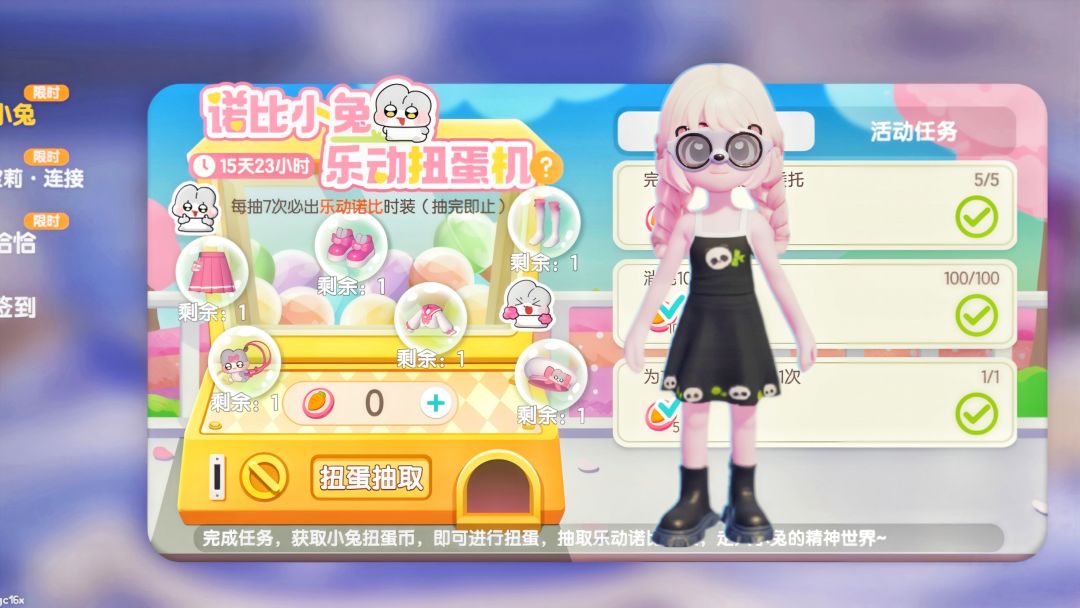 1、本周任务: 上线可在邮件内领取一千金币奖励 本周开启的潮流活动:【众筹活动】 本周任务奖励:潮流点数以及【熊猫眼墨镜】 2、【众筹活动】: 活动共两周时间,每周任务都有4个:参加一次本周的众筹活动,本周在众筹活动中完成自家众筹箱30%、60%以及100%的众筹贡献,都可以获得潮流代币奖励。 其中: 第5周完成自家众筹箱60%的众筹贡献,可以获得【熊猫短裙】奖励 3、【诺比小兔】联动活动玩法 #