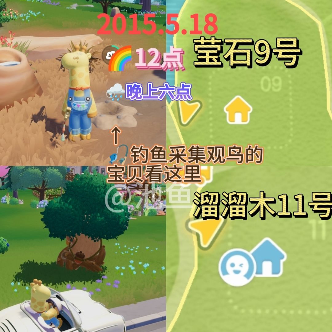 ①溜溜木: 6号房前(图1 图2) ②荧光石:2号房前(图3 图4) ③雨天朵朵: 文艺街(图5 菱形蓝色标志 持续到中午12点) ④彩虹朵朵:小镇中央广场公交站旁(图6 图7 中午12点持续到下午6点) ⑤彩虹泡泡:朵朵所在的中央广场两个 自己家门口一个(目前我所找到的) 附注: 可以在雨天朵朵、彩虹朵朵哪里购买棉花糖,解锁不同的图鉴 雨天会有不同的鱼、鸟、虫、种类出现,而彩虹天气有不同种类