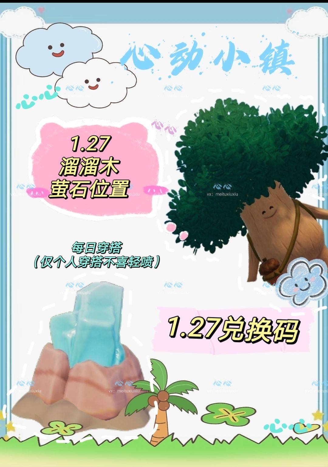 心动小镇1月20日 天气:晴 周三彩虹天 1.溜溜橡木:2号(溜溜木) 2.无暇萤石:8号(萤石) 3.今日礼包码:XD95X6T4 雪天朵朵在文艺街,彩虹朵朵在彩虹方向,彩虹花束在朵朵附近和家! 1.25新春季正式开始!骰子,棋牌,抽签,传送门,周四更新新春季! 1月份600号联动,全新家具和衣服,全新爱好狗狗,爱好等级提升至12级,各种联动! 心动小镇QQ1群:3890352(非官方鑫时代