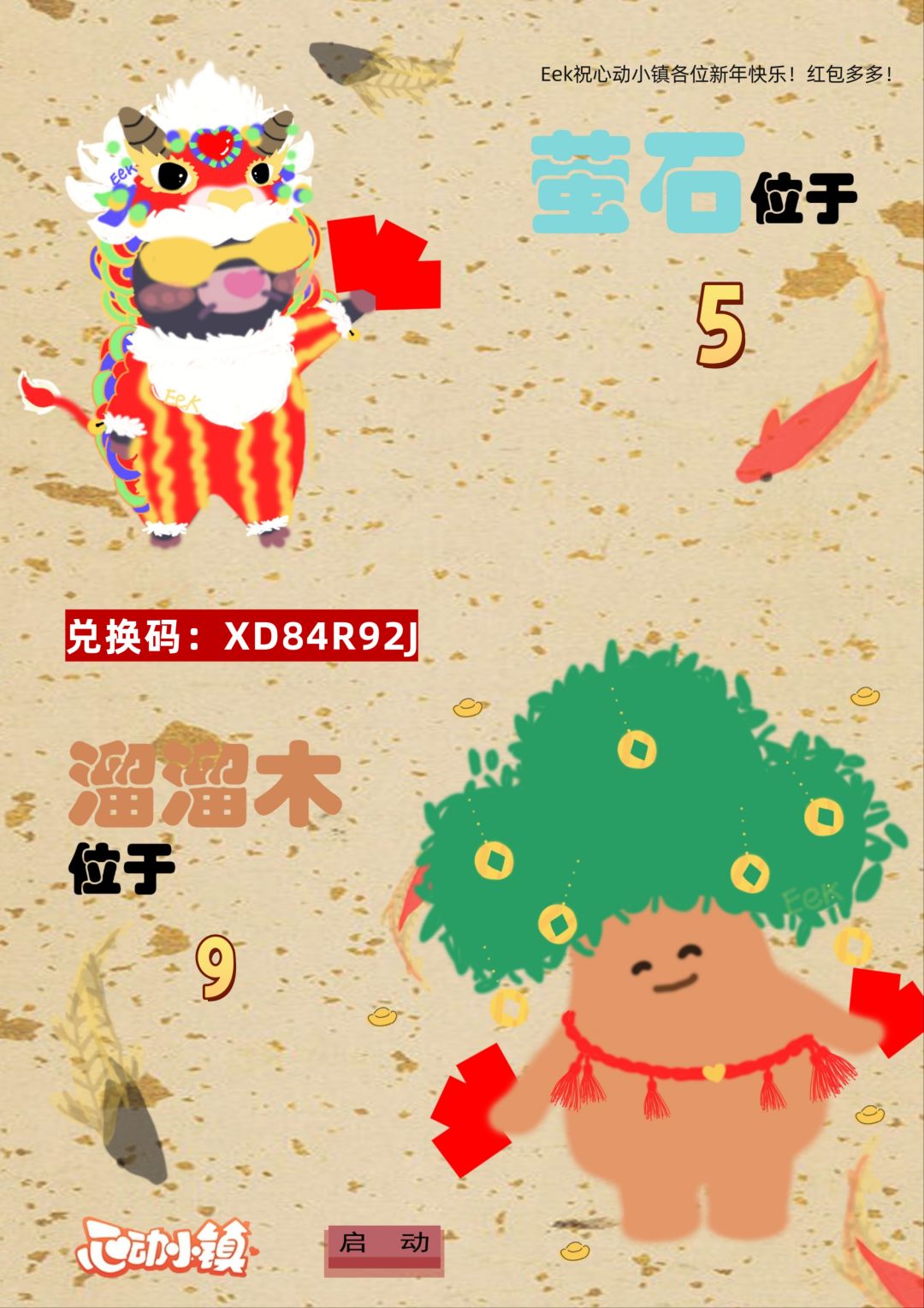新年快乐各位 兑换码:XD84R92J 萤石在5号位,溜溜木在9号位。 [心动小镇_点赞]东栈灯如昼攻略 [表情_狗头]雪天0:00-6:00 [表情_ohh]甜心绮梦上新预告 感谢阅读此次的Eek资讯。#心动小镇 #心动小镇创作计划 #心动小镇新春季 #新春季攻略征集