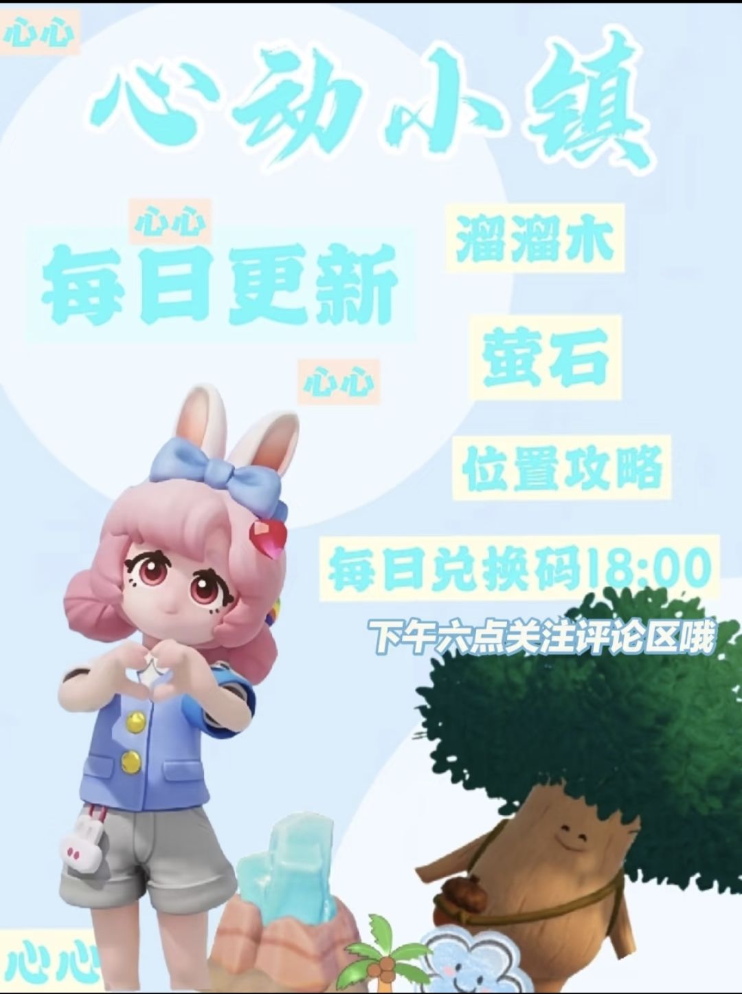 1.溜溜橡木(溜溜木👉🏻4 2.无暇荧石(荧光石👉🏻1 重要声明: https://www.taptap.cn/moment/648072326310529033?utm_medium=share&utm_source=copy&share_id=872F8C6522D3 3.天气:特殊天气看主页最新贴 4.时间表也在里面啦 5.g号心动小镇里面有每周礼包兑换码 6.某圈30天签到进行中 7.