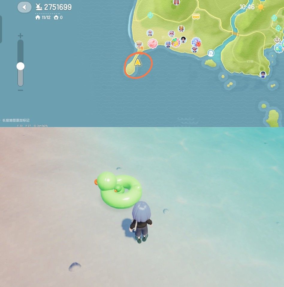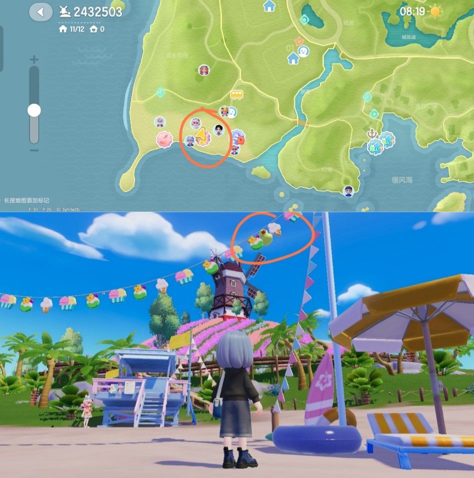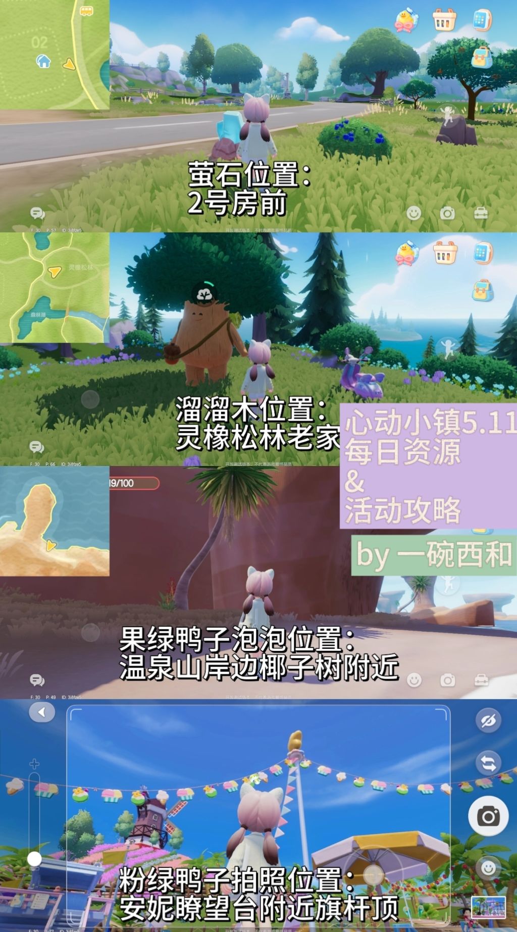 p1为总位置预览图 p2溜溜木在4号门前 p3荧光石在8号门前 p4 水蓝色鸭子在靠近海边的沙滩椅旁边 p5 粉色鸭子家具泡泡在鲸鱼海 #心动小镇 #游戏攻略