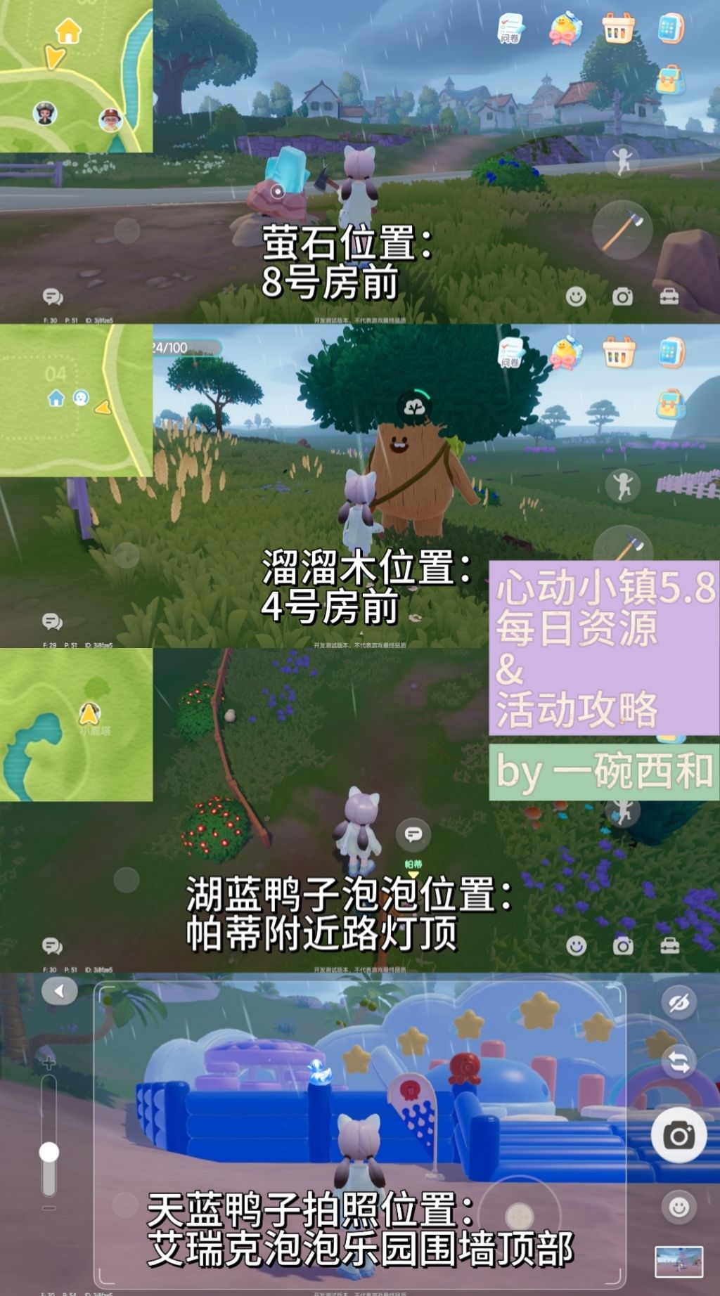 喜欢我的攻略请点赞[害羞R] 谢谢大家!!! 🌳每日资源: 萤石(8号房前) 溜溜木(4号房前) 季节限定任务: 拍照:天蓝鸭子(艾瑞克泡泡乐园围墙顶) 泡泡:湖蓝鸭子(帕蒂附近路灯顶如图所示) 💡今日tips:朵朵出现❗️❗️❗️(见p2) 朵朵会在今天6:00–12:00 18:-24:00【两个时间段】出现在小镇上,需要做任务“【雨与彩虹】—感受小镇的雨天并找到朵朵”的发展家不要错过哦!#心动小镇新居攻略