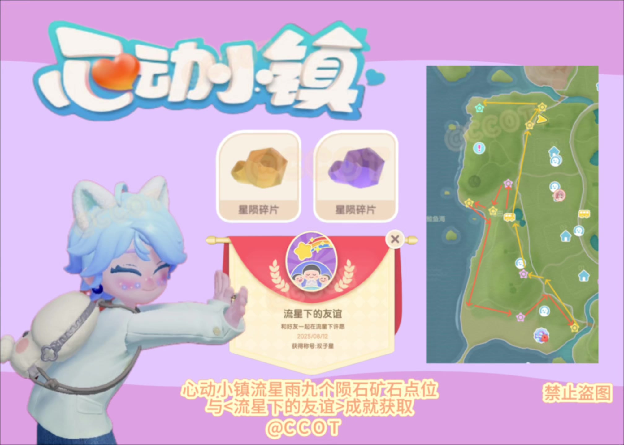 ① 图2:6种星陨碎片采集(目前可采集3种颜色星陨碎片,每个颜色各3个位置,共9个点位) ② 图3-4:朵朵位置和兑换商店(星陨家具和新单人许愿动作) ③ 图5-6:2个流星雨新成就(流星下的友谊、星尘收藏家) #心动小镇 #小马宝莉心动小镇周年联动 #动物新邻季攻略征集 #心动小镇攻略 #心动小镇日常 #心动小镇1周年庆