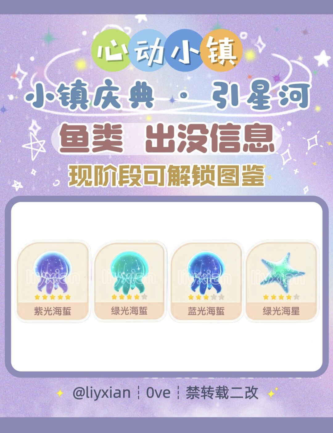 引星河的限定鱼类,均可在【鲸鱼海】获取。 4种目前可解锁的限定鱼【紫光海蜇】、【绿光海蜇】、【蓝光海蜇】以及【绿光海星】,都可以在全时间全天气的【鲸鱼海】里获得。 #心动小镇 #小马宝莉心动小镇周年联动 #心动小镇引星河 #小镇庆典引星河 #心动小镇攻略 #心动小镇日常