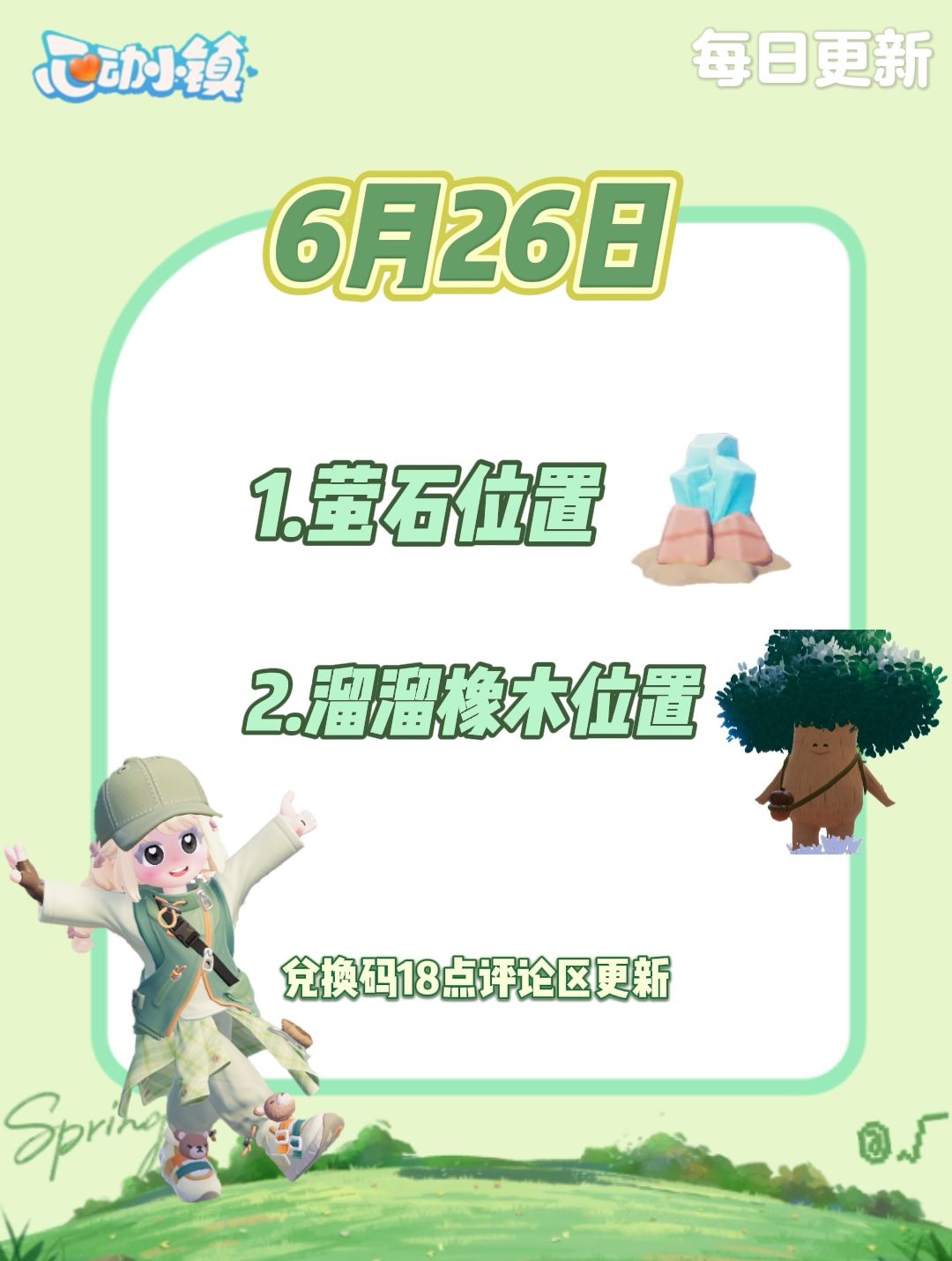 📅 今日必收: ✨溜溜橡木:6号家园门口(每日1次,每次3个,6点刷新) ✨无暇萤石:11号家园门口(同上,别错过!) 🎁 兑换码提示:18:00后【评论区】更新 ⏰ 海钓时间:12:00-21:00 | 引虫时间:11:00-20:00 📌 每日必做:采集资源囤材料,轻松攒道具不亏! 💡 小提醒:早上6点准时刷新,记得上线薅羊毛~ 👉 点赞关注,每天解锁最新资源点! #心动小镇 #小镇庆典春野令