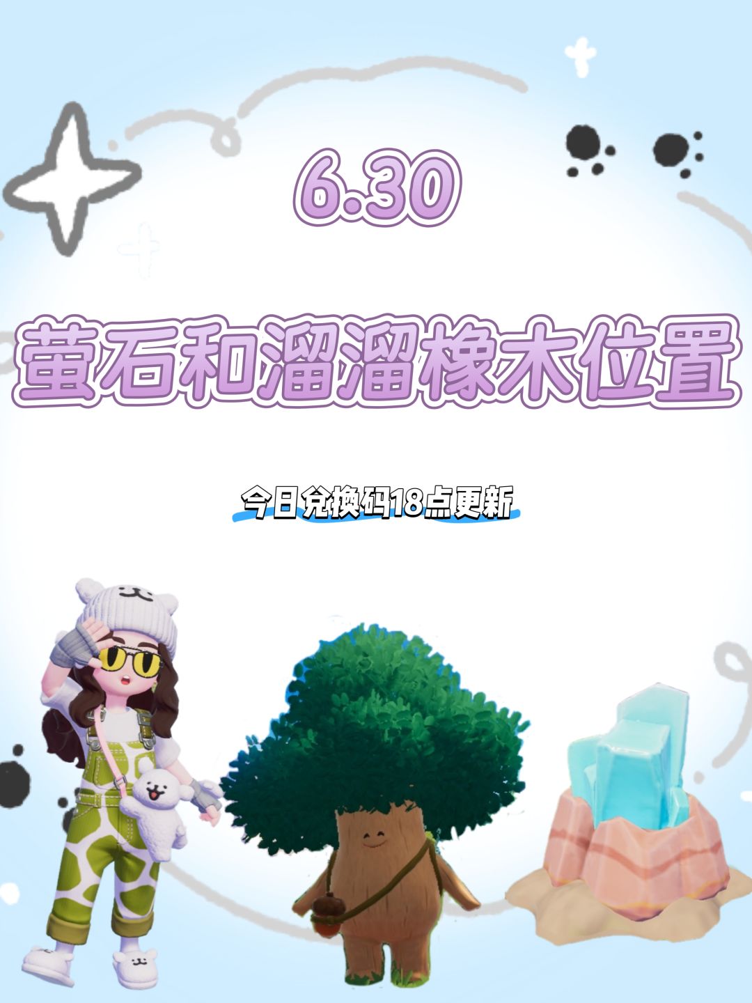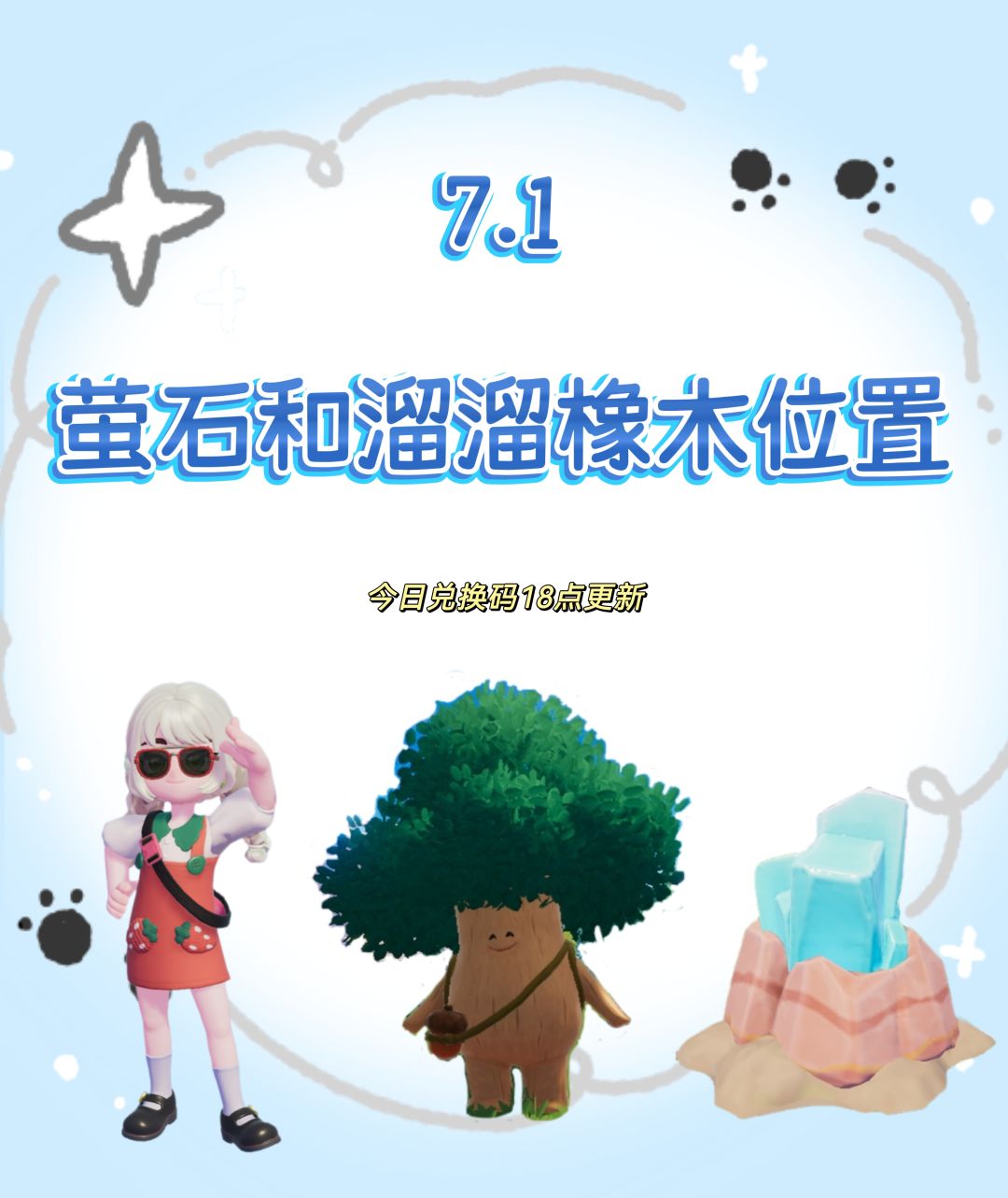 萤石:位于2号房门口 溜溜橡木:位于7号房门口 雨天朵朵:位于文艺街 明天凌晨00:00-06:00 🌧不要忘记在时间段内找朵朵买糖和雨伞哦 #心动小镇 #心动小镇创作计划 #小镇稚趣园 #小镇庆典稚趣园 #心动小镇无暇萤石 #心动小镇溜溜橡木 #心动小镇兑换码 #游戏日常 #游戏攻略 #游戏安利 #休闲游戏 #少女心游戏安利