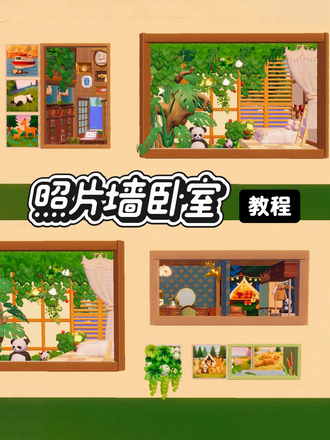 🌵教程运用了大量卡重叠,不会的宝子可以搜搜基础教程。 🌳斜面柱子旋转悬浮来自xhs@恩桃 老师的方法。柱子和苹果悬浮步骤有整理图文放在评论区了。右下小框部分较于之前有改动,参考了@🍊段段 老师的布局。 🪴墙面主要分为四个部分,以下是需要重叠的家具建材: ①睡前办公区:收藏家西西里书桌*2+木质支撑柱,收藏家展示台+简约灶台 ②森系床铺:环屿木质百叶窗+地板,龟背竹+怪奇歪脖枯树,萌兰联名摆件+方形