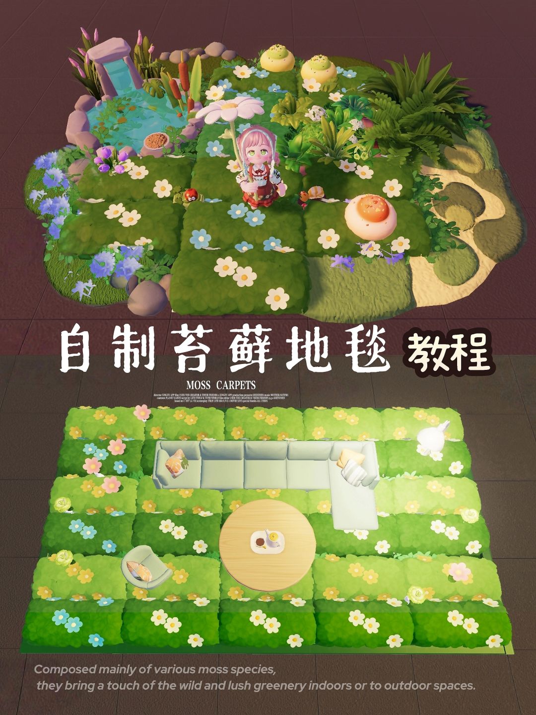 🪴将野外的生机与葱郁绿意带入室内,可以根据自己需要放上家具。 🌿第一种方形地毯大小根据自己装修调整。 🌾第二种不规则地毯没有苔藓地毯做装饰的话可以用绿色短绒地毯和小鸟地毯代替,紧挨放置需要卡重叠。带观鸟池塘可以在旁边放张躺椅。 #心动小镇 #心动小镇创作计划 #小镇稚趣园 #游戏装修