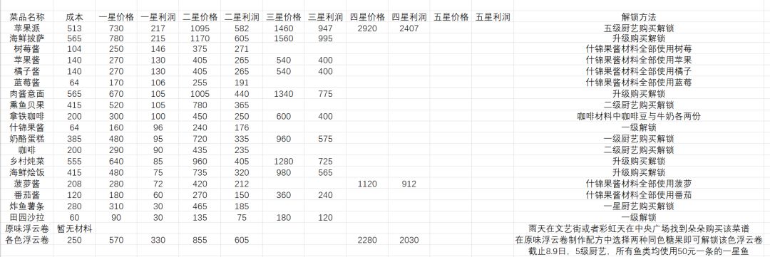 表正在完善中,菜品顺序按照一星利润从上到下排序,欢迎大家告诉我其他菜的高星价格或者纠错,本人入坑4天目前6级钓鱼,4级园艺,5级厨艺,3级捕虫,4级观鸟,苦于没有升级券,如果有方法获得更多的话求告知。 厨艺和园艺钓鱼是三个联动性很强的爱好,专心厨艺的话优先带着园艺一起升其次是钓鱼,做菜种田是一种比较轻松的玩法,比较适合小伙伴们不高强度肝的情况下玩哈哈哈,采集党除外,采果子实在是太肝了,臣妾做不到。