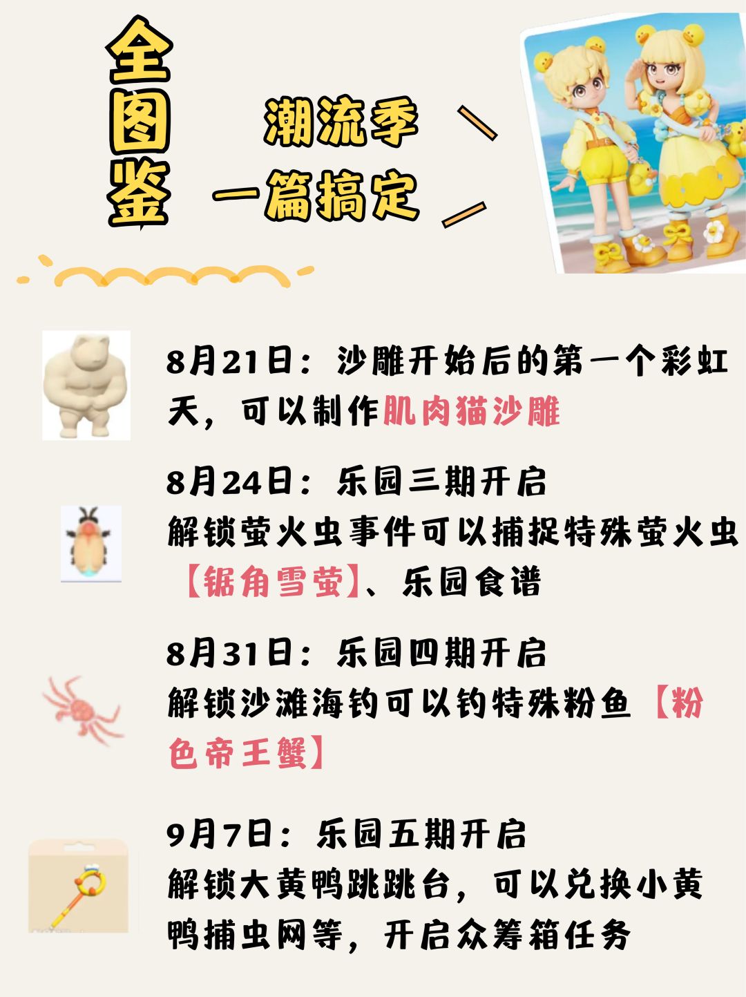1.本周三是沙雕开始后的第一个彩虹天,可以制作肌肉猫沙雕,备好100个沙雕底座坐等 2.萤火虫都是在18点至次日六点出没的,白天没有,三期以后可以开启萤火虫事件白天也可以有 3.四期以后潮流季海钓的粉红帝王蟹可以用来做清蒸帝王蟹,嘎嘎划算的~~~ 4.做果汁比做果酱挣钱,所以潮流季期间多多做果汁鸭~椰子水也还不错~ #心动小镇 #心动小镇创作计划 #心动小镇攻略 #沙滩乐园季创作计划 #心动小镇潮