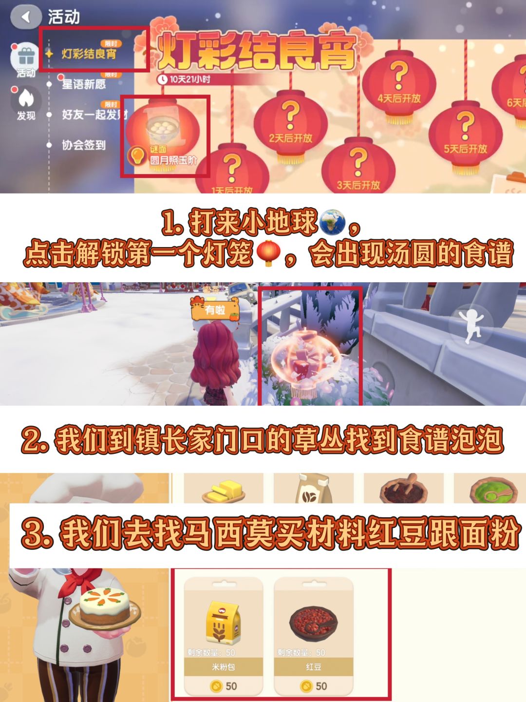 1.打来小地球🌍, 点击解锁第一个灯笼🏮,会出现汤圆的食谱 2.我们到镇长家门口的草丛找到食谱泡泡 3.我们去找马西莫买材料红豆跟面粉 4.食材:面粉2+红豆🫘2 5.注意这个汤圆是在普通灶台就可以做哦 #心动小镇 #心动小镇创作计划 #心动小镇新春季 #新春季攻略征集