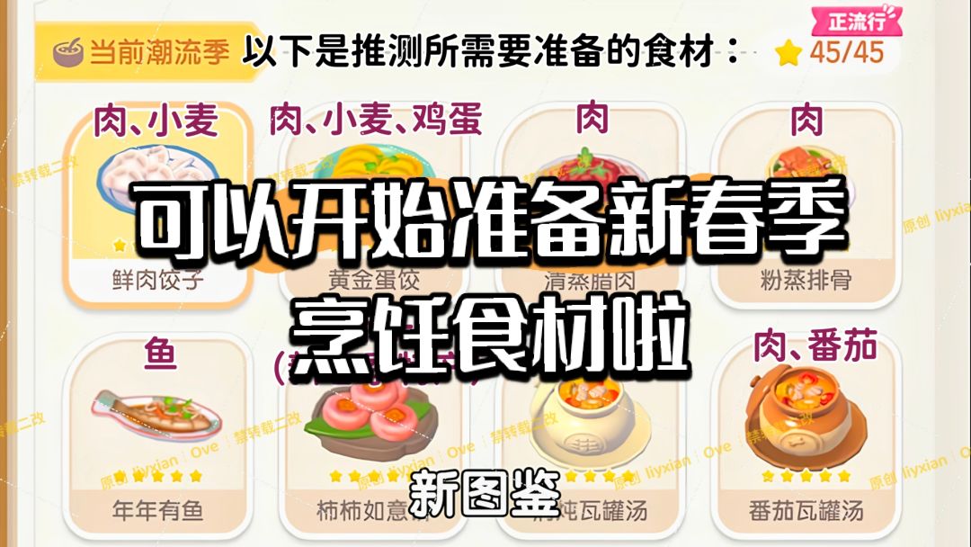 ① 新春季新图鉴: 雪雕15个 鱼类4个 烹饪食谱9个 昆虫4个 园艺2个 观鸟4个 ② 烹饪食谱推测需要准备的食材(根据官方爆料的图进行推测): △肉(多囤)、小麦、鸡蛋、番茄、鱼类(备一些低价鱼) 鲜肉饺子:肉、小麦 黄金蛋饺:肉、鸡蛋、小麦 清蒸腊肉:肉 粉蒸腊肉:肉 年年有鱼:鱼类 柿柿如意饼:柿子(新春季限定园艺新图鉴) 清炖瓦罐汤:肉 番茄瓦罐汤:肉、番茄#心动小镇