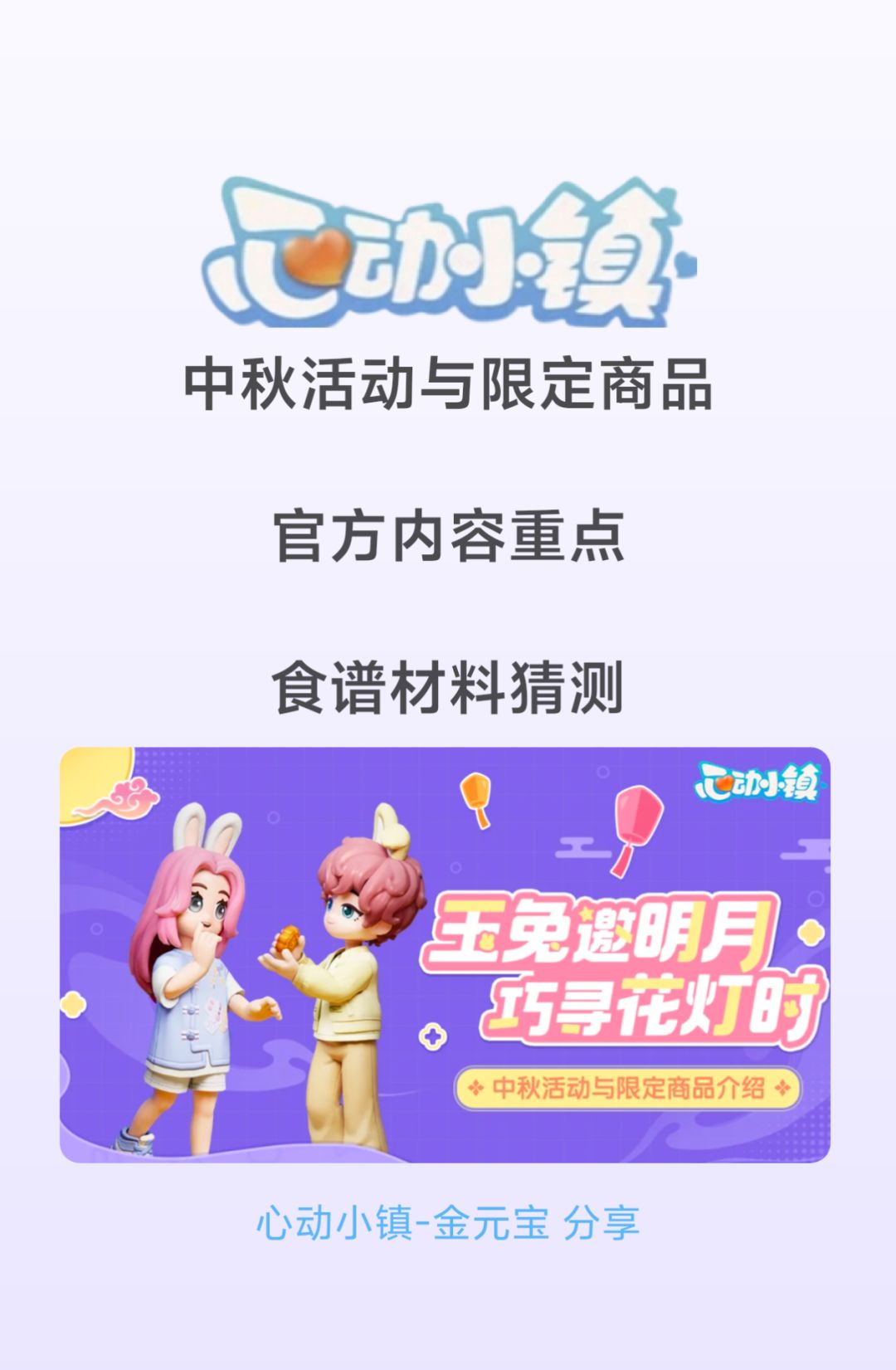 中秋官方内容重点: 1️⃣9月14日和9月21日,橡果百货屋将限时上新商品服装【月桂琵琶襟短袖】、【奔月玉兔棒球服】、头饰“立耳玉兔头箍”、“折耳玉免头箍”、家具以及其他当周精选百货。 服装家具每周六在商城精选页面上架,共两期内容。 2️⃣9月13日至9月28日,参与【巧寻花灯时】活动,根据提示解开花灯上的谜题,寻找藏在小镇角落里的泡泡,即可获得中秋限定家具。 3️⃣同时,在中秋限定商店中还可以用