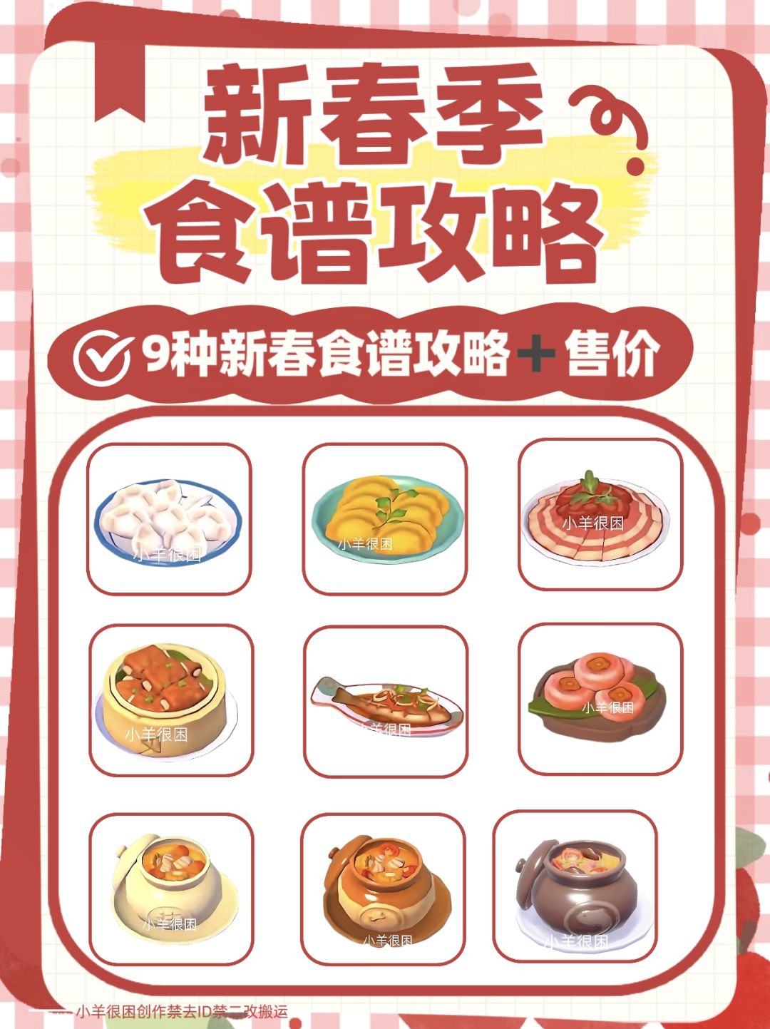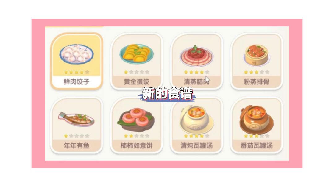 新增的食谱,隐藏食谱解锁方法。 鲜肉饺子 黄金蛋饺 清蒸腊肉 粉蒸排骨 年年有鱼 柿柿如意饼 清炖瓦罐汤 番茄瓦罐汤 气鲜瓦罐汤 真有过年菜的气氛啊, 年年有余,还有饺子,有汤。 解锁方法 找到马西莫对话, 完成新春美味活动, 就能得6个新食谱, 还有东方炉灶,(在潮流商店也能买) 得到直接摆放好。 还有3个 【隐藏食谱】 1个是黄金饺子,鲜肉饺子解锁 食材配方【鲜肉饺子】正常是两份肉 把其中一份