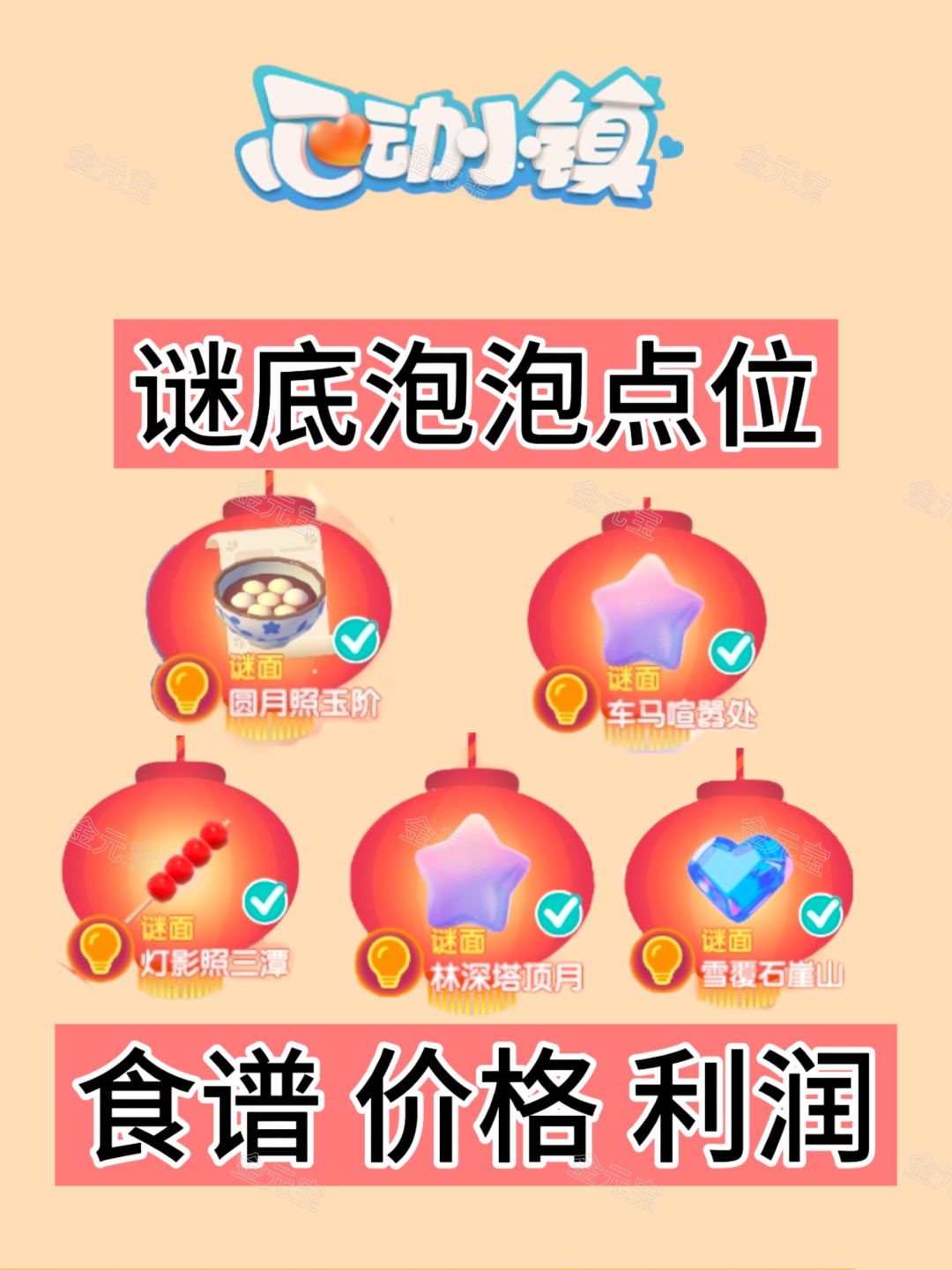 屏幕上地球→活动→灯彩结良宵 ,先点开谜题 1.圆月照玉阶(豆沙汤圆食谱) 泡泡在阿塔拉的市政厅正面 2.车马喧嚣处(满愿星) 泡泡在安德鲁旁边路牌 3.灯影照三潭(糖葫芦) 泡泡在9号家园旁边路牌 4.林深塔顶月(满愿星) 森林的小鹿塔上面 5.雪覆石崖山(月光水晶) 温泉山的亭子里 —————————————— 在马西莫购买米粉包、红豆 用常驻的炉子做[豆沙汤圆] 豆沙汤圆=2米粉包+2红豆 豆