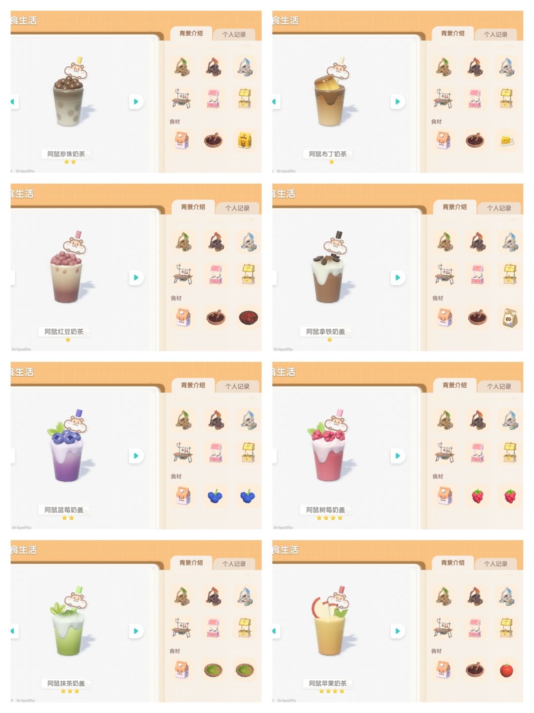 共17个 看看你都解锁了嘛 食材:茶叶 可可豆 各类水果 红茶 抹茶粉 牛奶 原食谱:奶昔 醇香红茶饮 清新绿茶饮 什锦果酱 其他食谱:各类奶昔9种 巧克力酱 香浓奶茶 可可奶茶 清新奶绿 抹茶奶绿 烹饪园艺爱好食谱菜谱图鉴攻略食材获取菜品价格 #心动小镇 #心动小镇线条小狗联动 #心动小镇攻略