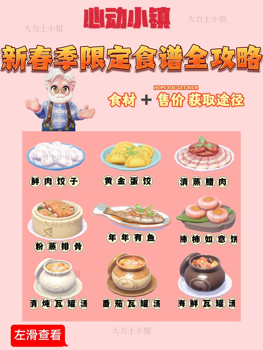 鲜肉饺子 清蒸腊肉 粉蒸排骨 年年有鱼 柿柿如意饼 清炖瓦罐汤 还有三个隐藏食谱哦 黄金蛋饺 番茄瓦罐汤 海鲜瓦罐汤 新春季菜谱解锁食材获取图鉴成本售价攻略 #心动小镇攻略 #心动小镇创作计划 #心动小镇 #心动小镇新春季