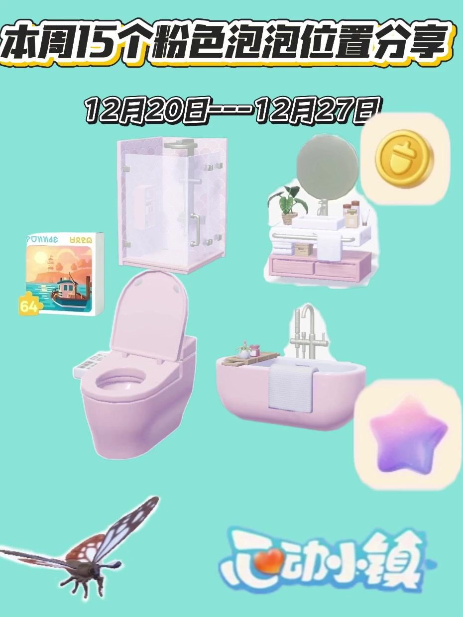 本周共15个泡泡位置已全部更新 泡泡里物品随机:如满愿星,家具,材料等 卫浴四件套(粉色浴缸,马桶,洗手台,淋浴间)#心动小镇 #心动小镇创作计划 #心动小镇每周泡泡 #心动小镇甄嬛传联动
