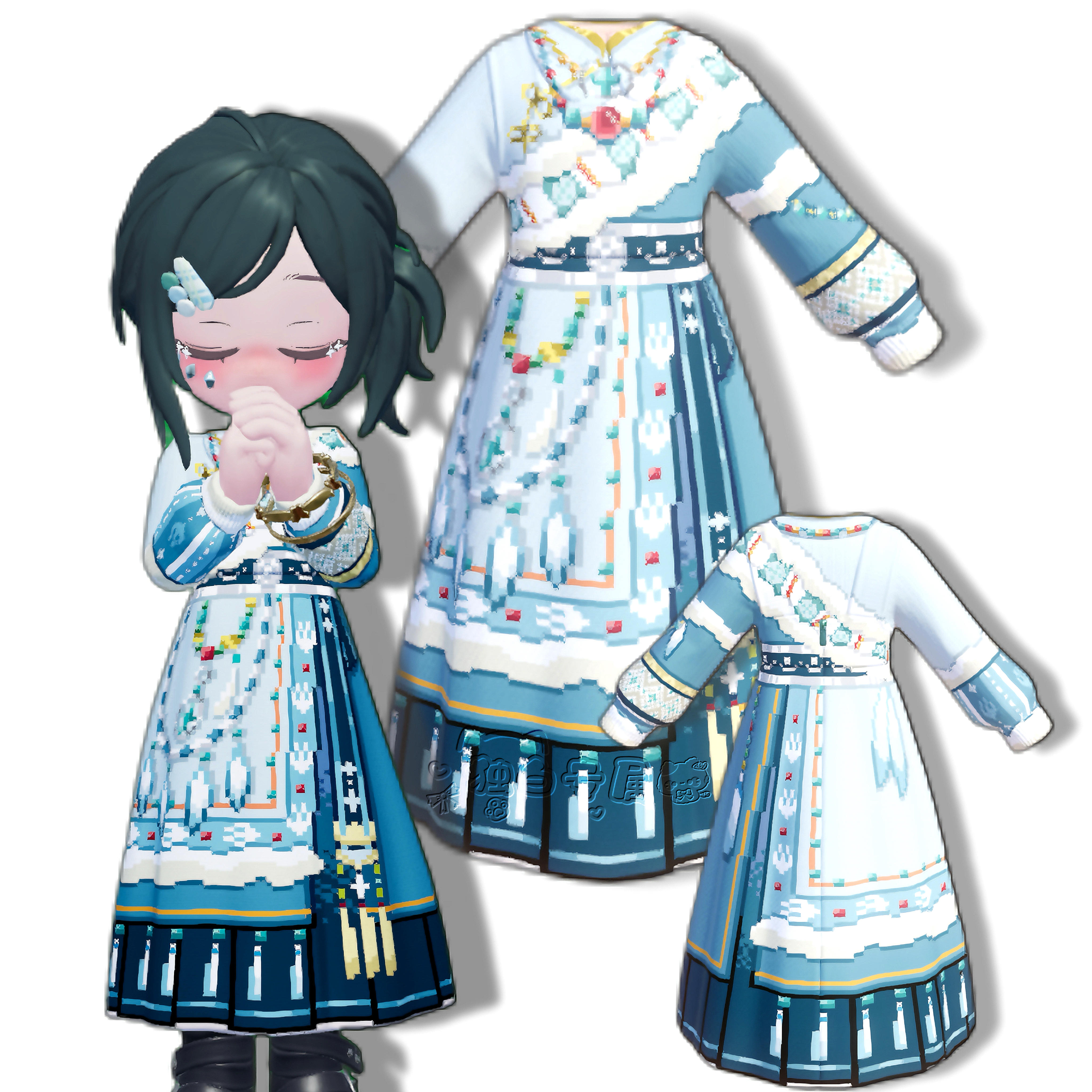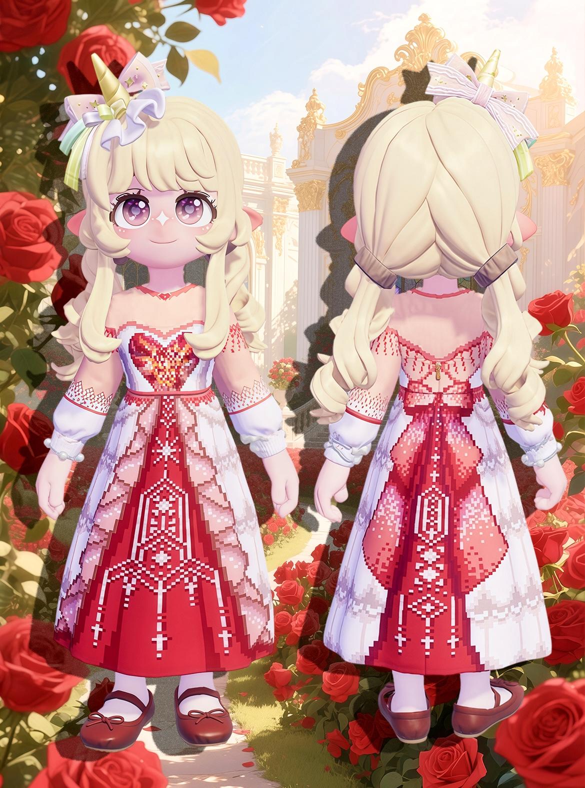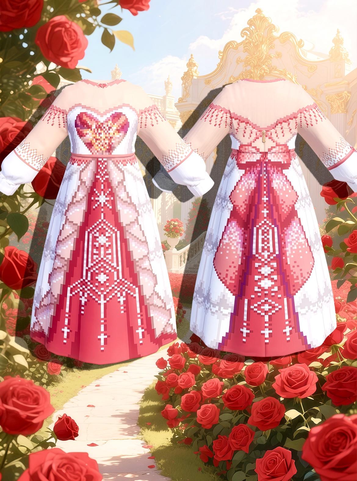鎏金之秘上半身:浅米色的半透长袖轻盈柔和,袖口是蓬松的白色泡泡袖设计,袖身点缀着细密的红色像素格纹,精致又俏皮。胸前醒目的像素风爱心图案尤为吸睛,色彩从橙红到粉红渐变,如同被暖意焐热的刺绣心焰,充满温柔的仪式感。裙身:红白渐变的像素纹样呈放射状向裙摆延伸,裙身中央是对称的几何图腾,带着东欧或高加索传统织物的异域韵味,仿佛部落匠人用针线织就的祈福纹路。裙摆垂坠感十足,红色底边点缀着细碎的白色小十