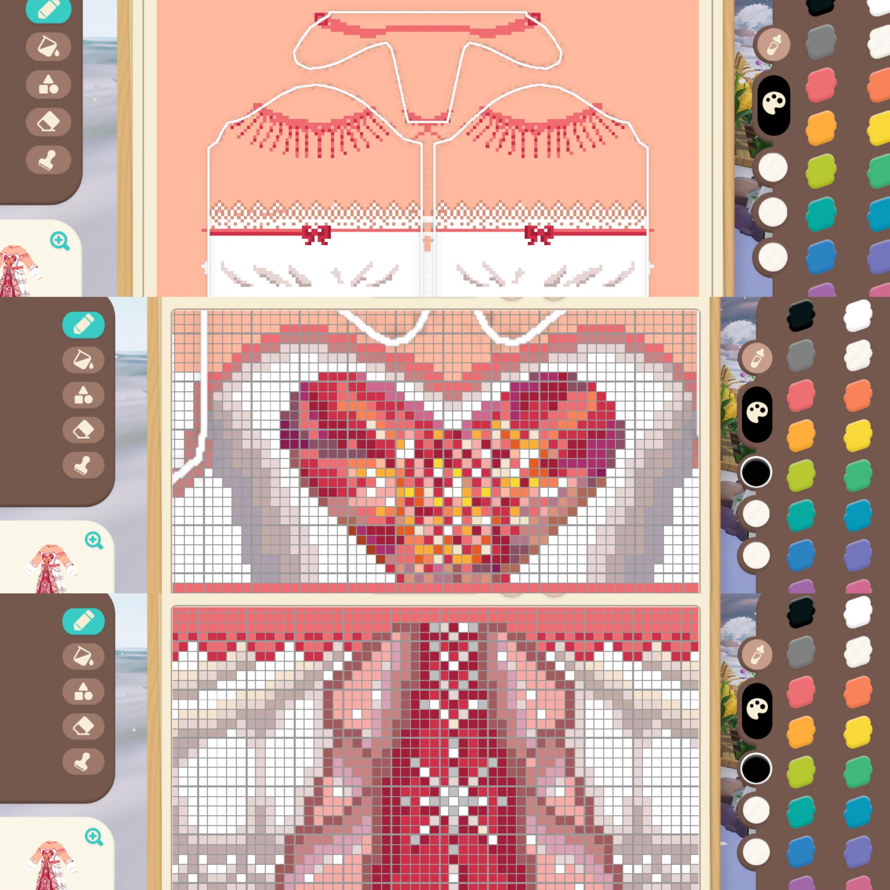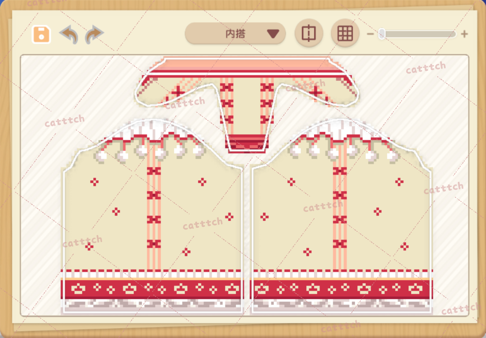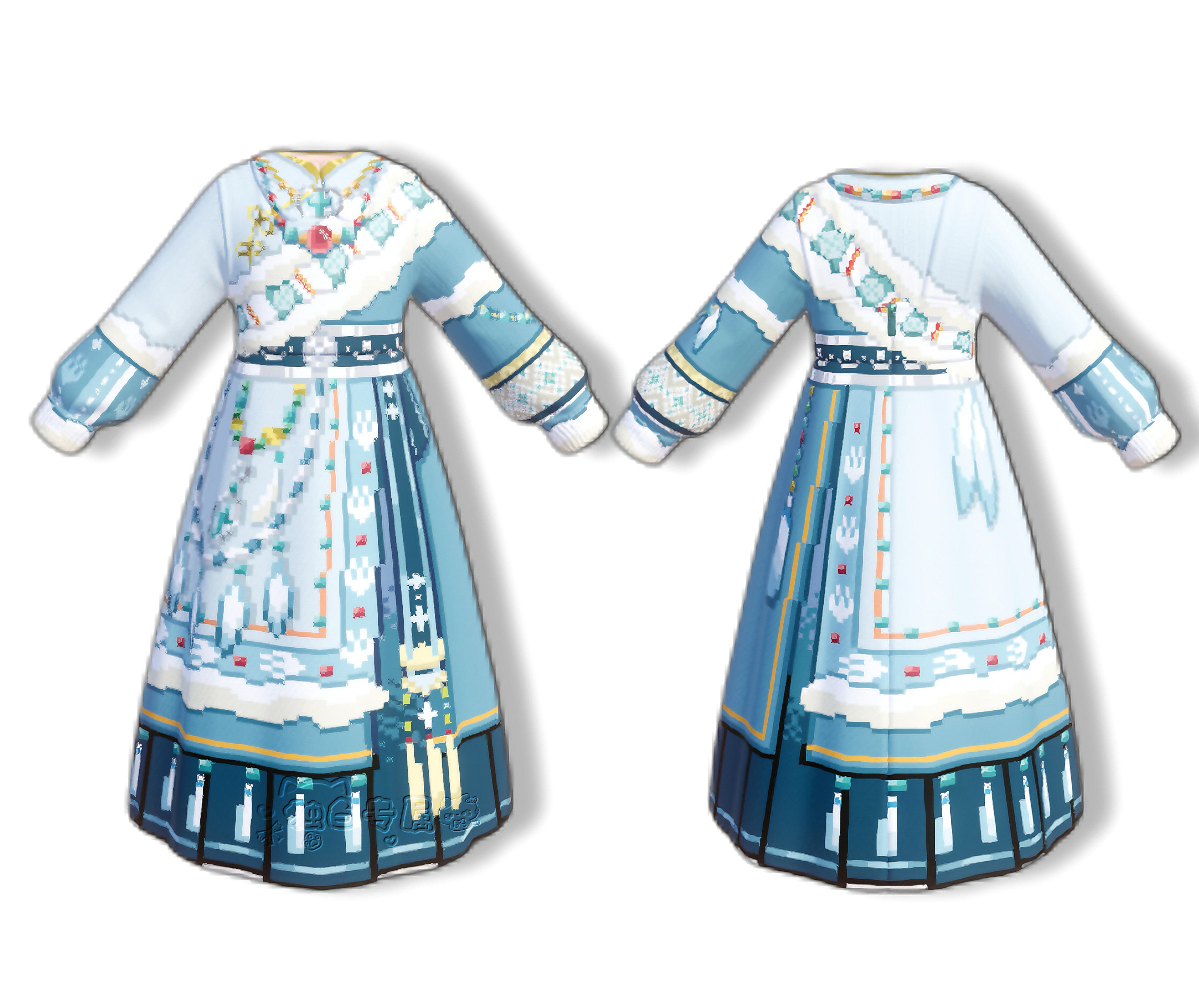 鎏金之秘上半身:浅米色的半透长袖轻盈柔和,袖口是蓬松的白色泡泡袖设计,袖身点缀着细密的红色像素格纹,精致又俏皮。胸前醒目的像素风爱心图案尤为吸睛,色彩从橙红到粉红渐变,如同被暖意焐热的刺绣心焰,充满温柔的仪式感。裙身:红白渐变的像素纹样呈放射状向裙摆延伸,裙身中央是对称的几何图腾,带着东欧或高加索传统织物的异域韵味,仿佛部落匠人用针线织就的祈福纹路。裙摆垂坠感十足,红色底边点缀着细碎的白色小十