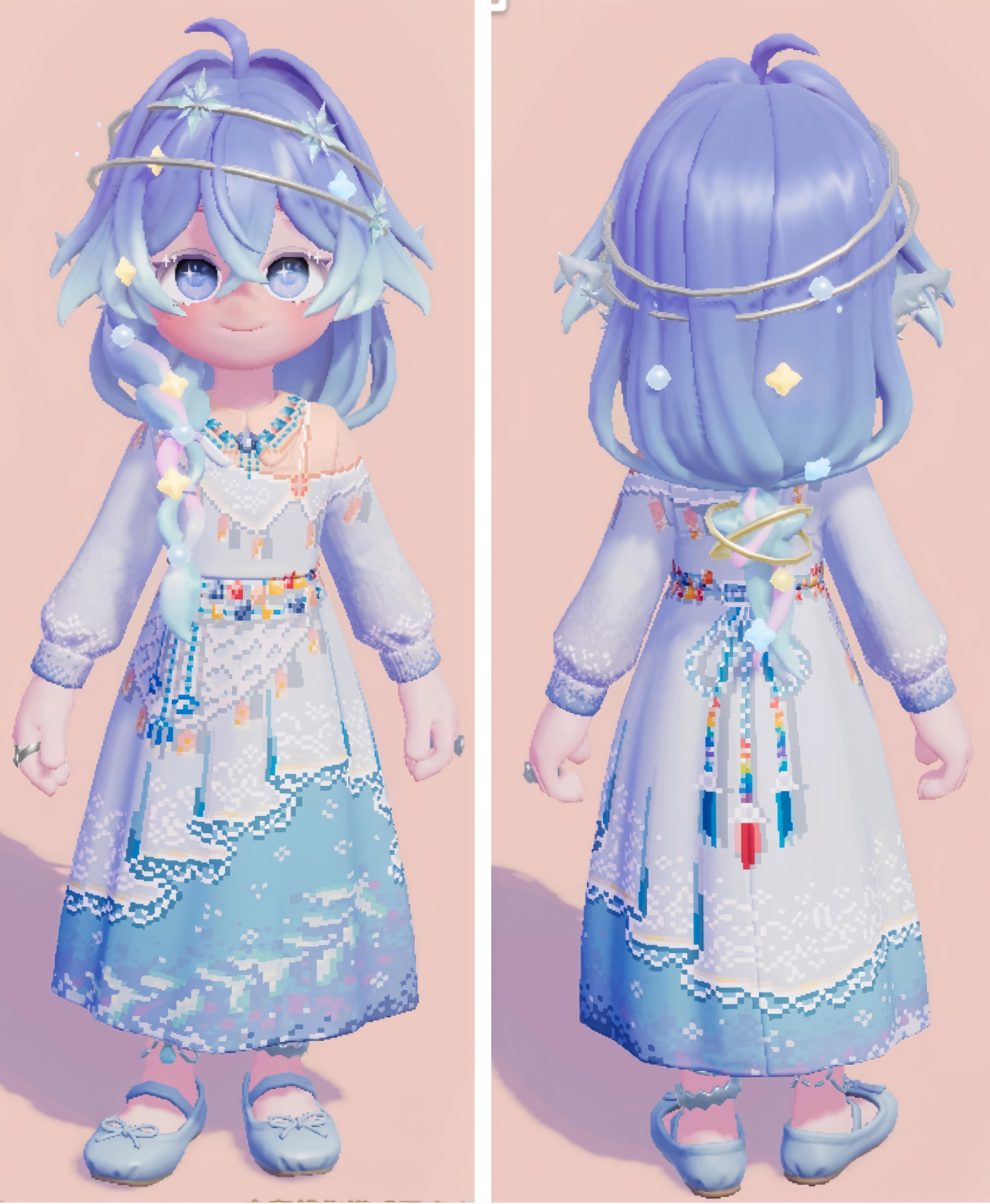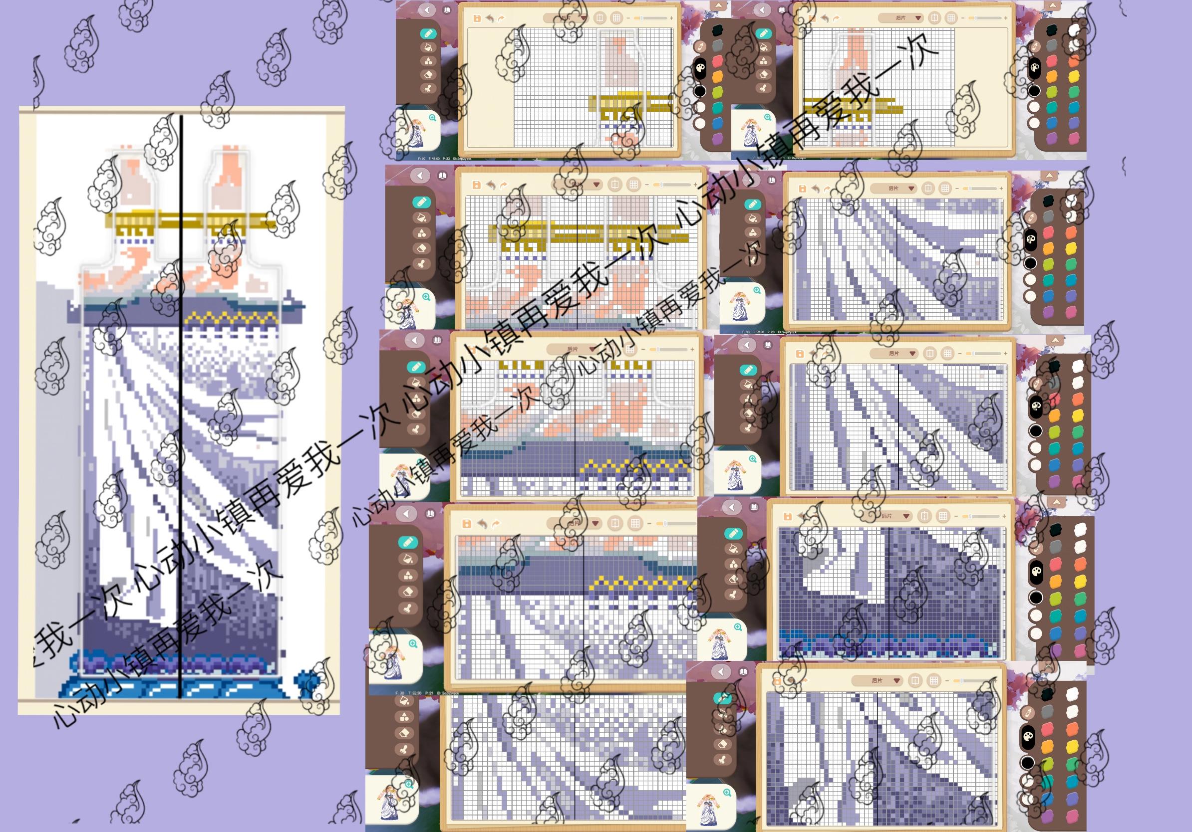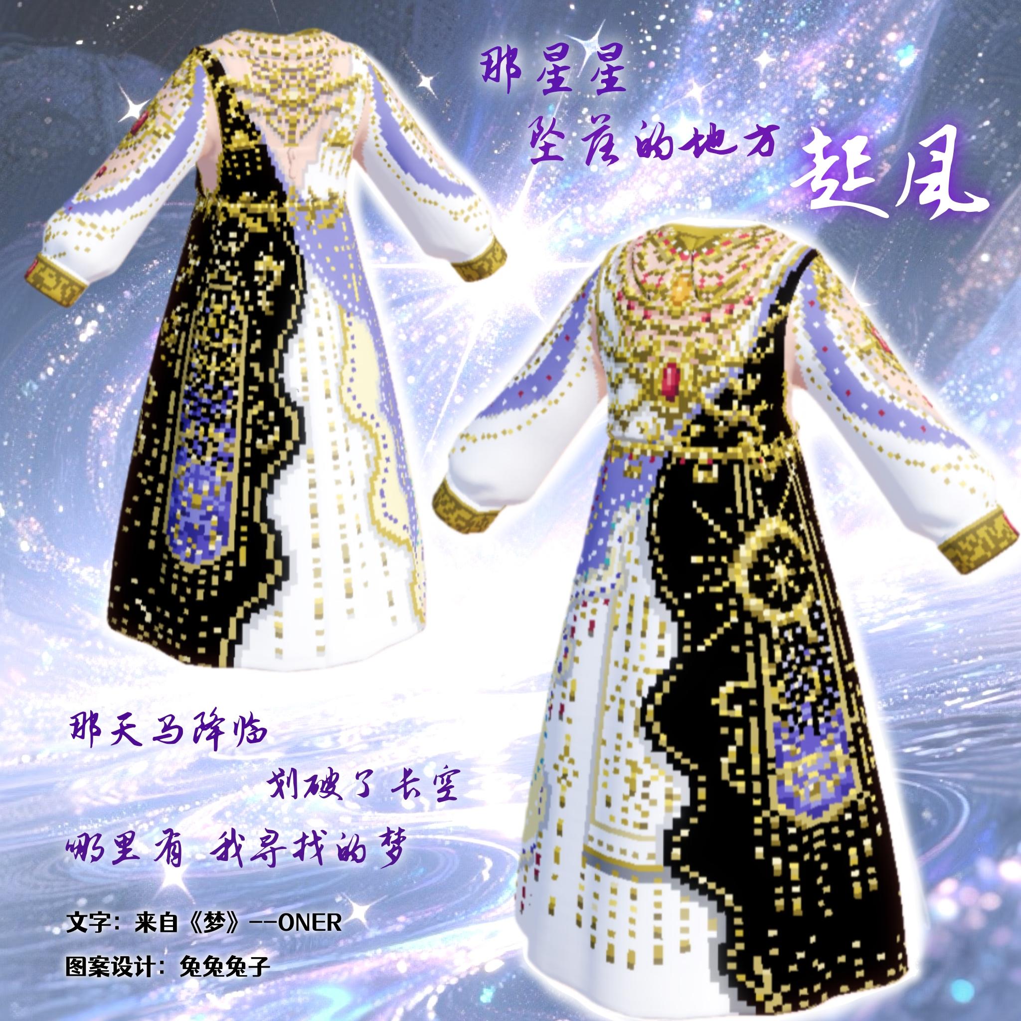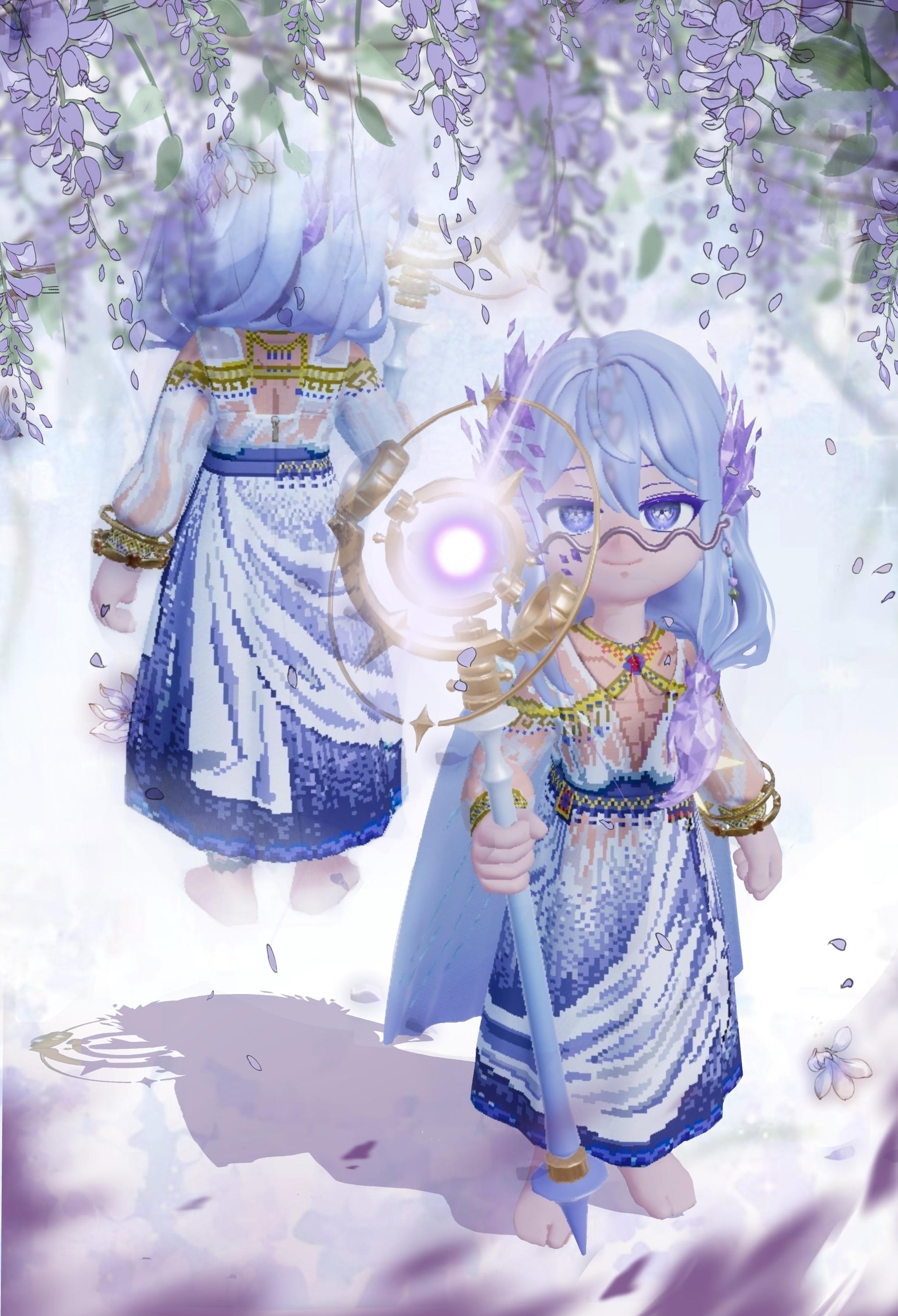 此作品为烬月祭衣。紫藤花下燃烬的月光和魔法杖交织的神秘祭祀,运用蓝紫色调,领口与袖口上添加了独特的异域风装饰,通过层层叠叠的衣襟配饰展现独特的异域风情。格子图已附,喜欢的宝宝可以投一票自取格子图#心动小镇域风织彩
