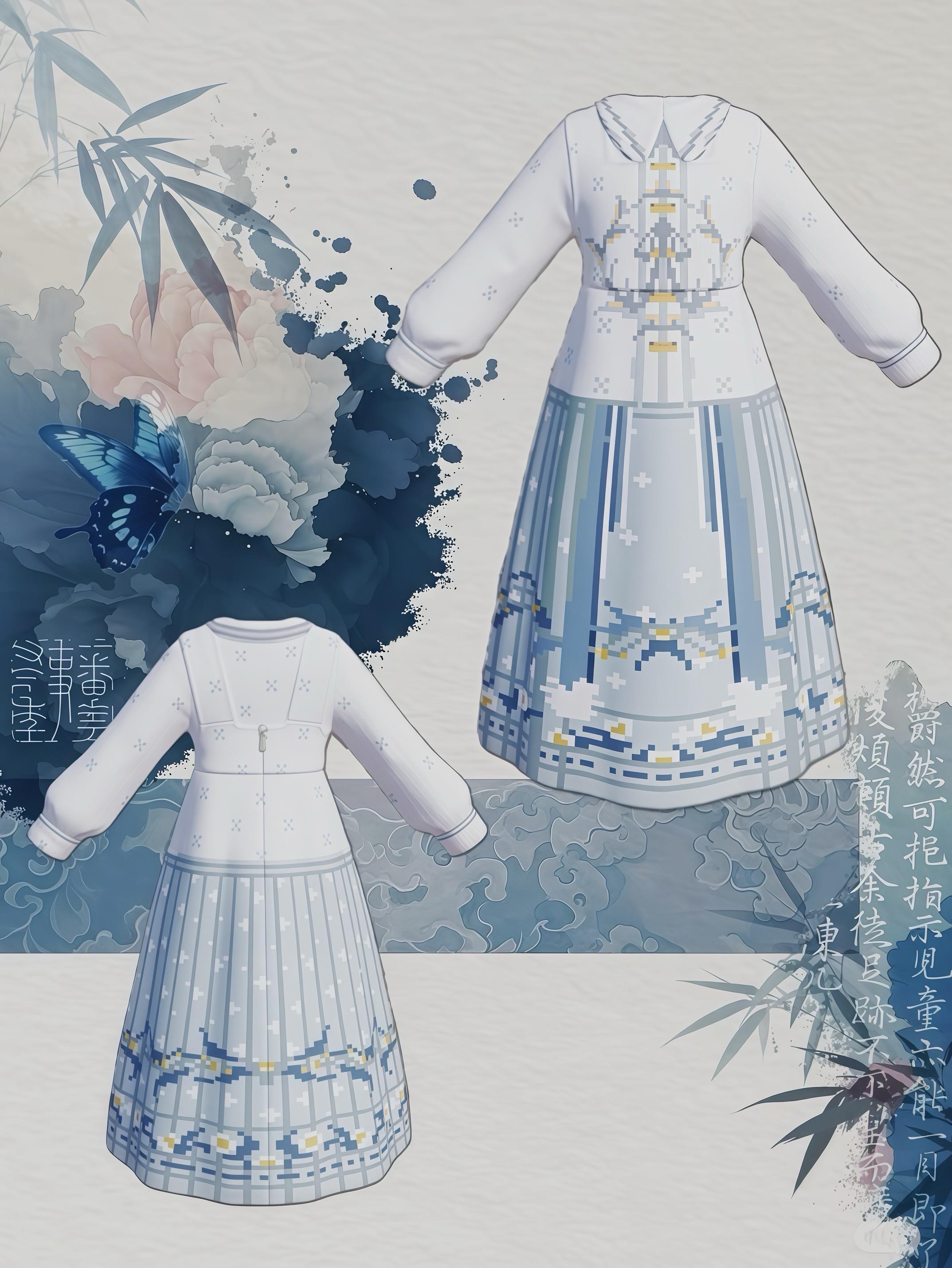 这套服饰以明代袄裙为形制原型,采用淡雅的青白配色,像素化织纹还原了明代“暗花纱”的精致肌理。复刻了明代江南仕女服饰的温婉细节,整体设计将明代文人画中的清雅意境织入衣料,让传统汉服的古典气质在小镇中焕发新生。#心动小镇域风织彩