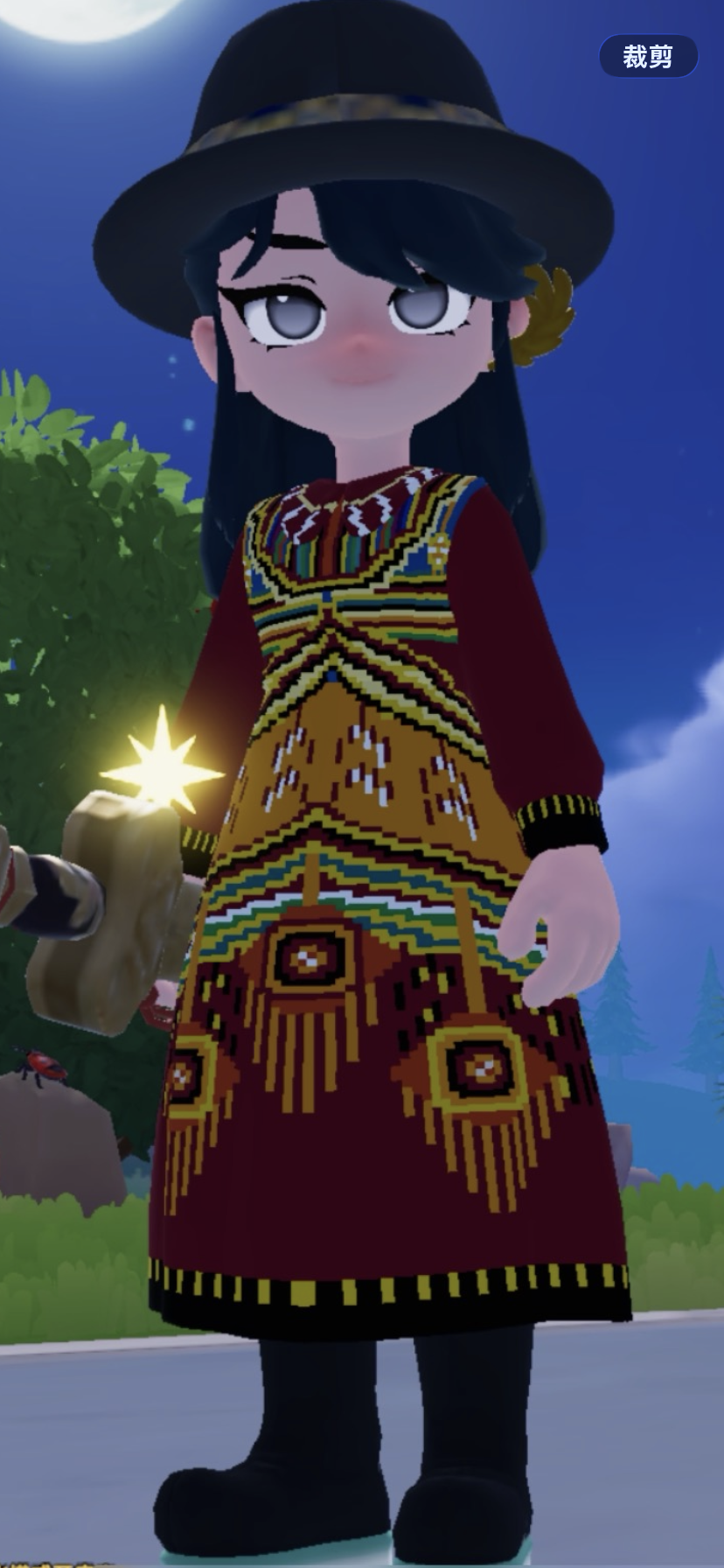 此作品为烬月祭衣。紫藤花下燃烬的月光和魔法杖交织的神秘祭祀,运用蓝紫色调,领口与袖口上添加了独特的异域风装饰,通过层层叠叠的衣襟配饰展现独特的异域风情。格子图已附,喜欢的宝宝可以投一票自取格子图#心动小镇域风织彩