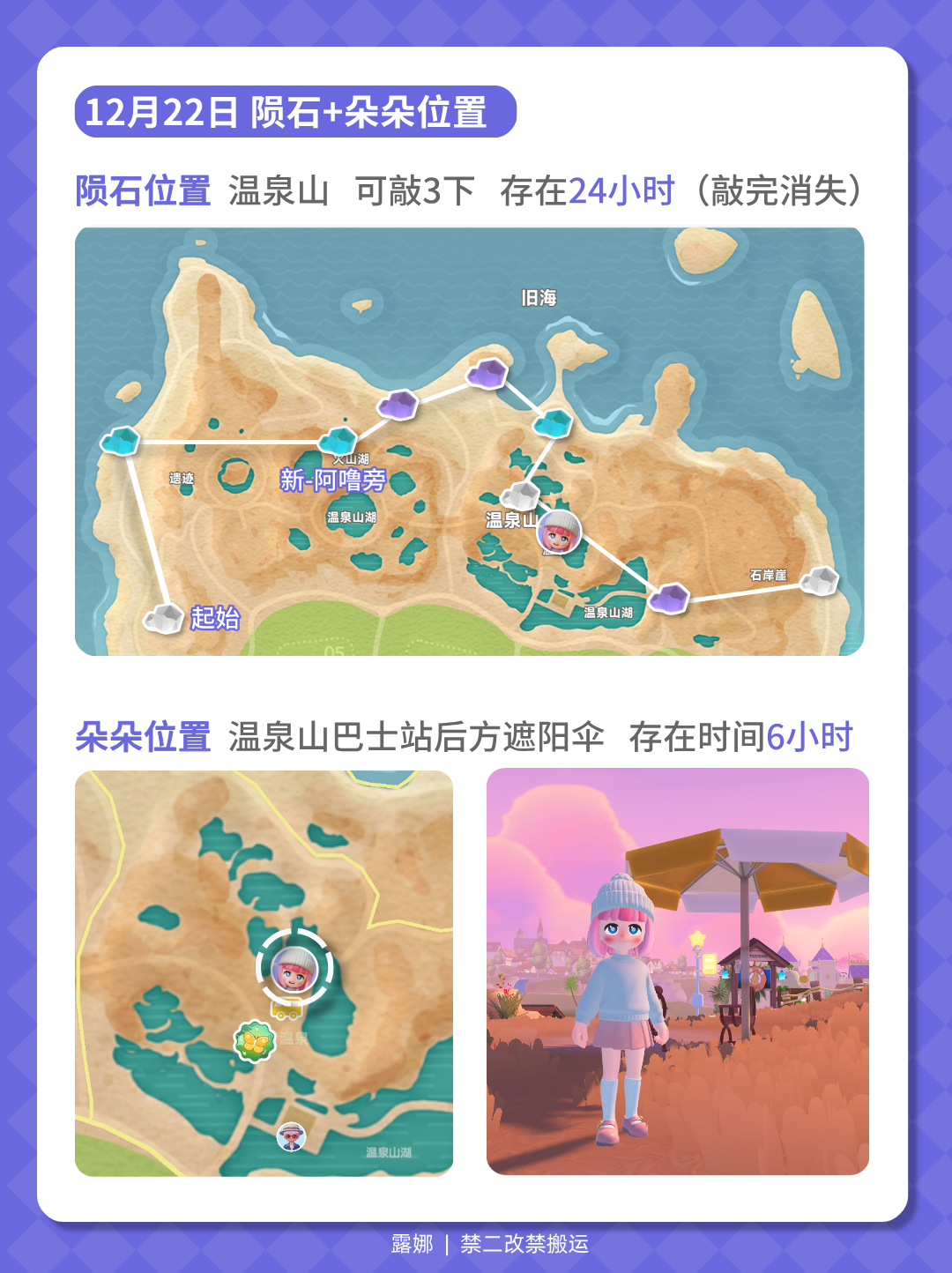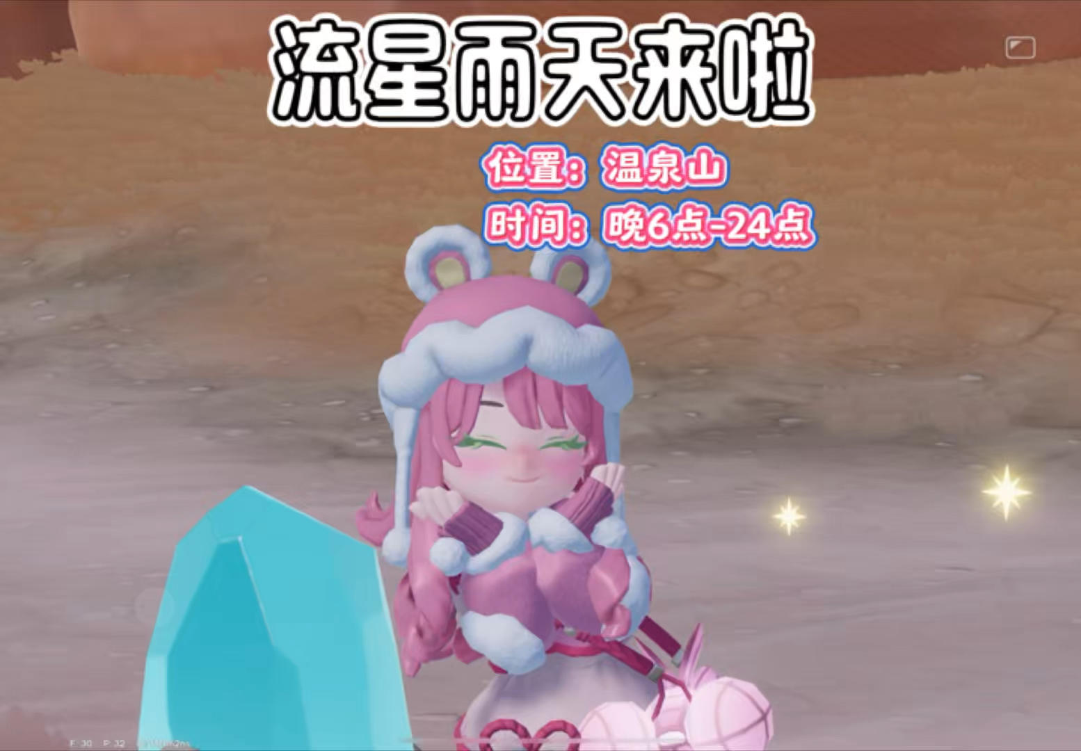 流星雨时间 18~24点朵朵位置 温泉山巴士站后方遮阳伞全9个星陨矿石位置陨石位置见图流星雨玩法+流星雨成就获取见图 !!注意!!陨石存在改为24小时啦,敲完消失但朵朵存在时间还是6小时哦!#心动小镇 #心动小镇攻略