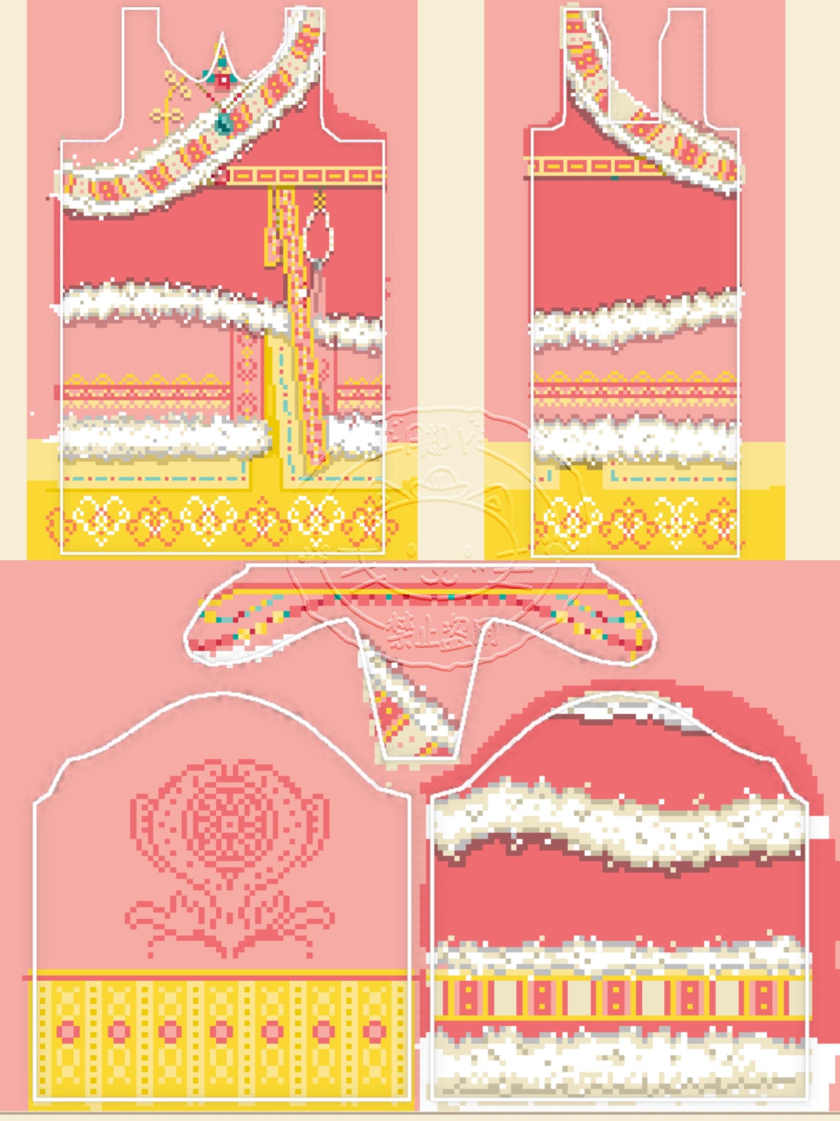 鎏金之秘上半身:浅米色的半透长袖轻盈柔和,袖口是蓬松的白色泡泡袖设计,袖身点缀着细密的红色像素格纹,精致又俏皮。胸前醒目的像素风爱心图案尤为吸睛,色彩从橙红到粉红渐变,如同被暖意焐热的刺绣心焰,充满温柔的仪式感。裙身:红白渐变的像素纹样呈放射状向裙摆延伸,裙身中央是对称的几何图腾,带着东欧或高加索传统织物的异域韵味,仿佛部落匠人用针线织就的祈福纹路。裙摆垂坠感十足,红色底边点缀着细碎的白色小十
