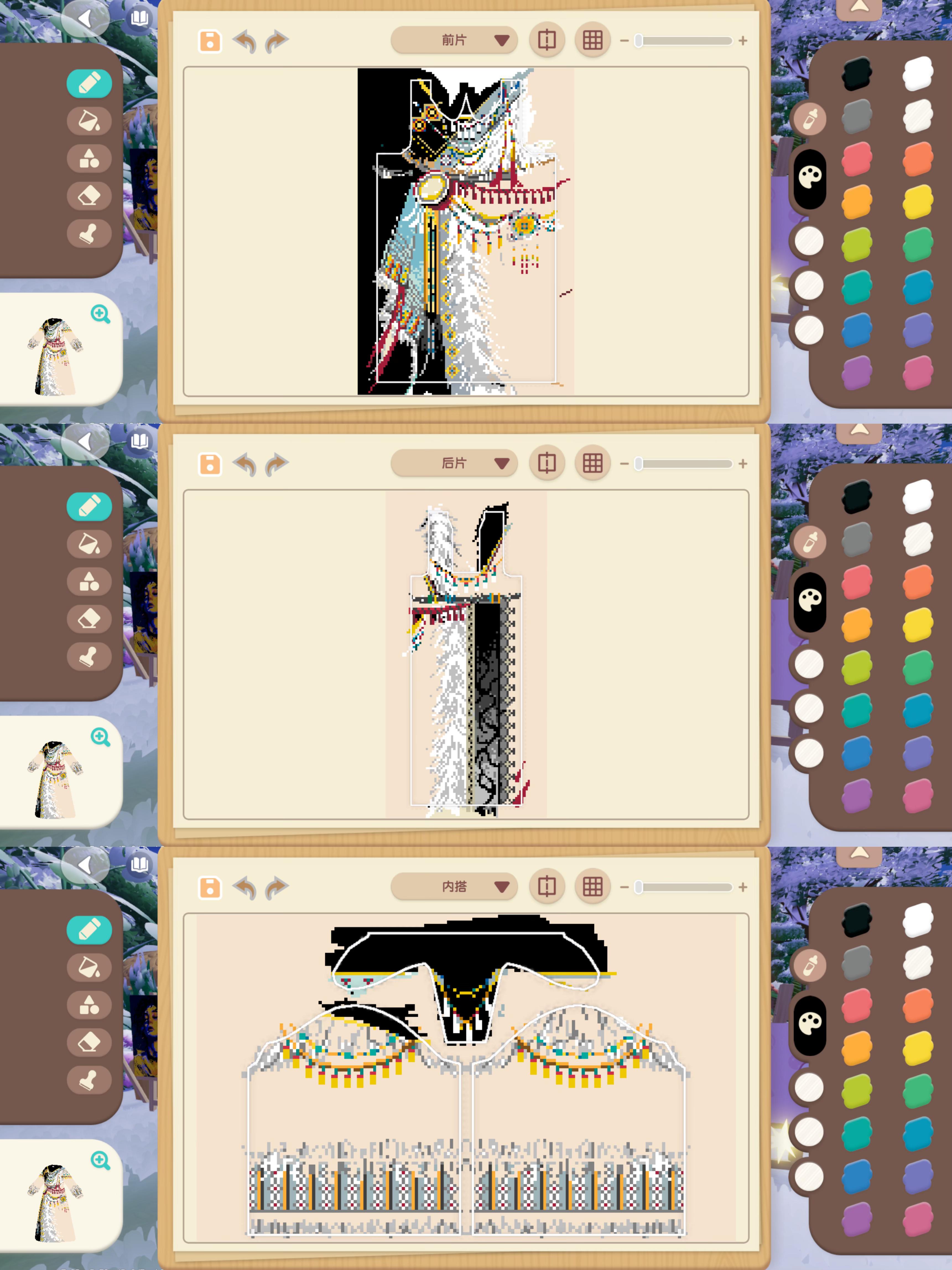 此作品为烬月祭衣。紫藤花下燃烬的月光和魔法杖交织的神秘祭祀,运用蓝紫色调,领口与袖口上添加了独特的异域风装饰,通过层层叠叠的衣襟配饰展现独特的异域风情。格子图已附,喜欢的宝宝可以投一票自取格子图#心动小镇域风织彩