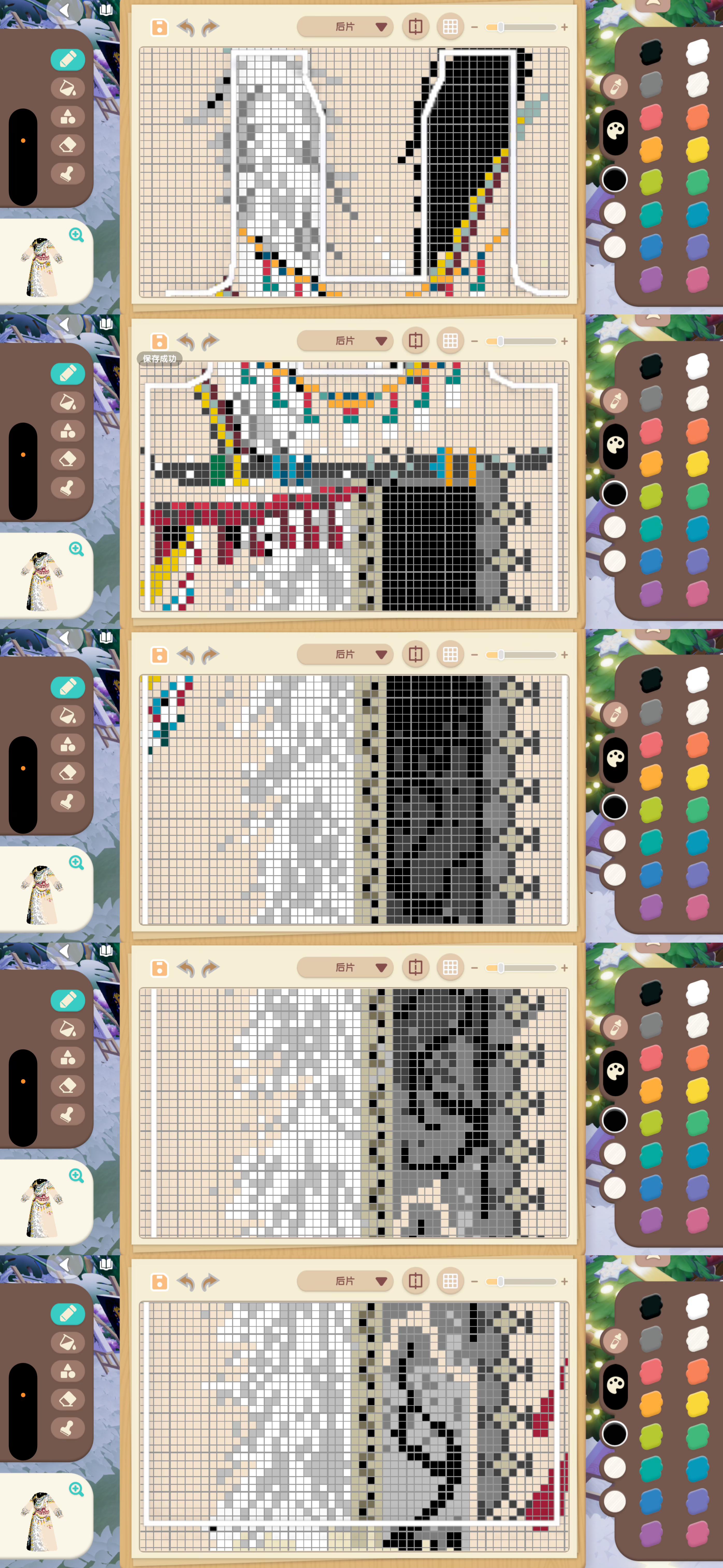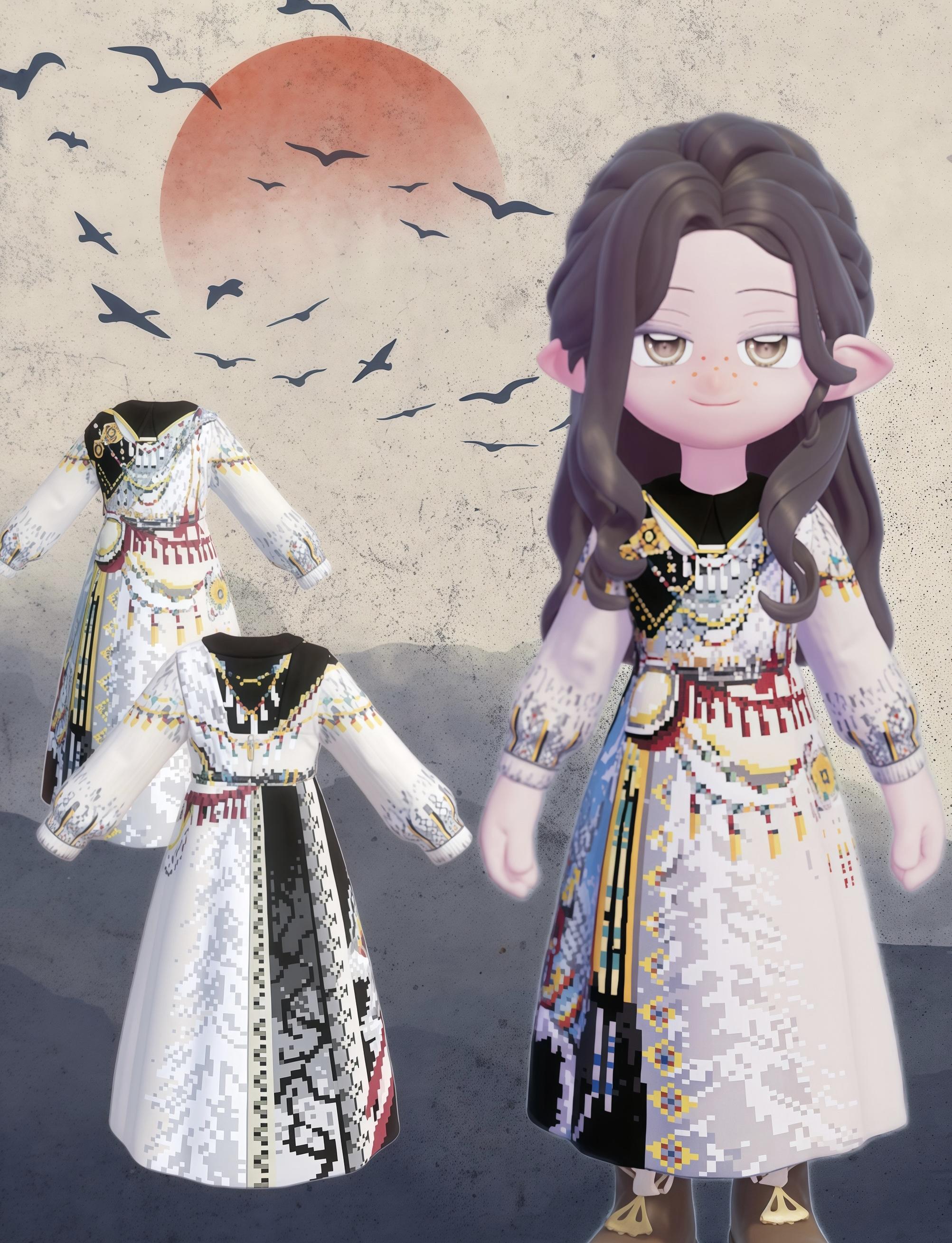 这套服饰以藏族传统氆氇织物为核心灵感,白底为底,用像素化织纹还原了藏袍纹样的粗犷肌理与宗教符号的神秘质感。领口的黑色镶边与腰间的红金系带,复刻了藏装的华贵细节,流动的纹样仿佛将青藏高原的经幡猎猎与神山圣湖的辽阔织入衣料。设计紧扣“域风织彩”主题,让藏地的文化温度成为小镇角色可穿戴的高原印记。#心动小镇域风织彩