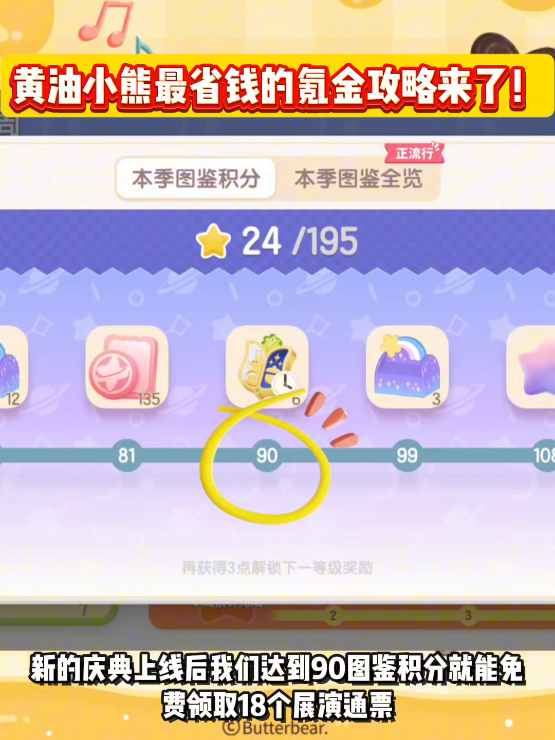 黄油小熊最省钱的氪金攻略来了!今天就来带你们算一下花多少钱可以拿下黄油小熊,煮波参考去年的线条小狗载具池子,大保底是348展演通票,假设奖池持续30天,我们先花费54元购买3个正式会员,上线30天共可获得540红钻和60展演通票,小镇庆典引星河9月27日结束,新的庆典上线后我们达到90图鉴积分就能免费领取18个展演通票,我们花费30元购买基础庆典手册,达到60级就能获得36展演通票和返还300红钻