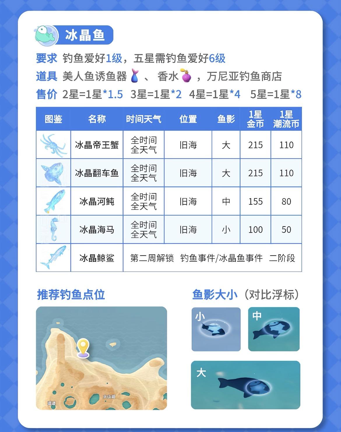 冰雪季限定内容为玩家带来了新的资源流通体系与经济循环机遇。本次攻略将围绕稀缺资源获取、生产配方转化与关键任务优先级三个维度,解析如何系统性达成全图鉴并实现资产增值。核心稀缺资源:冰晶鱼的生态定位与价值链提升冰晶鱼作为版本顶级鱼类,其生态具有显著时空限制性:仅于游戏内时间21:00-03:00在冰湖中心坐标区域刷新。捕获需满足双重条件:完成前置任务解锁区域,并使用限定鱼饵“星光虫饵”。其基础商店