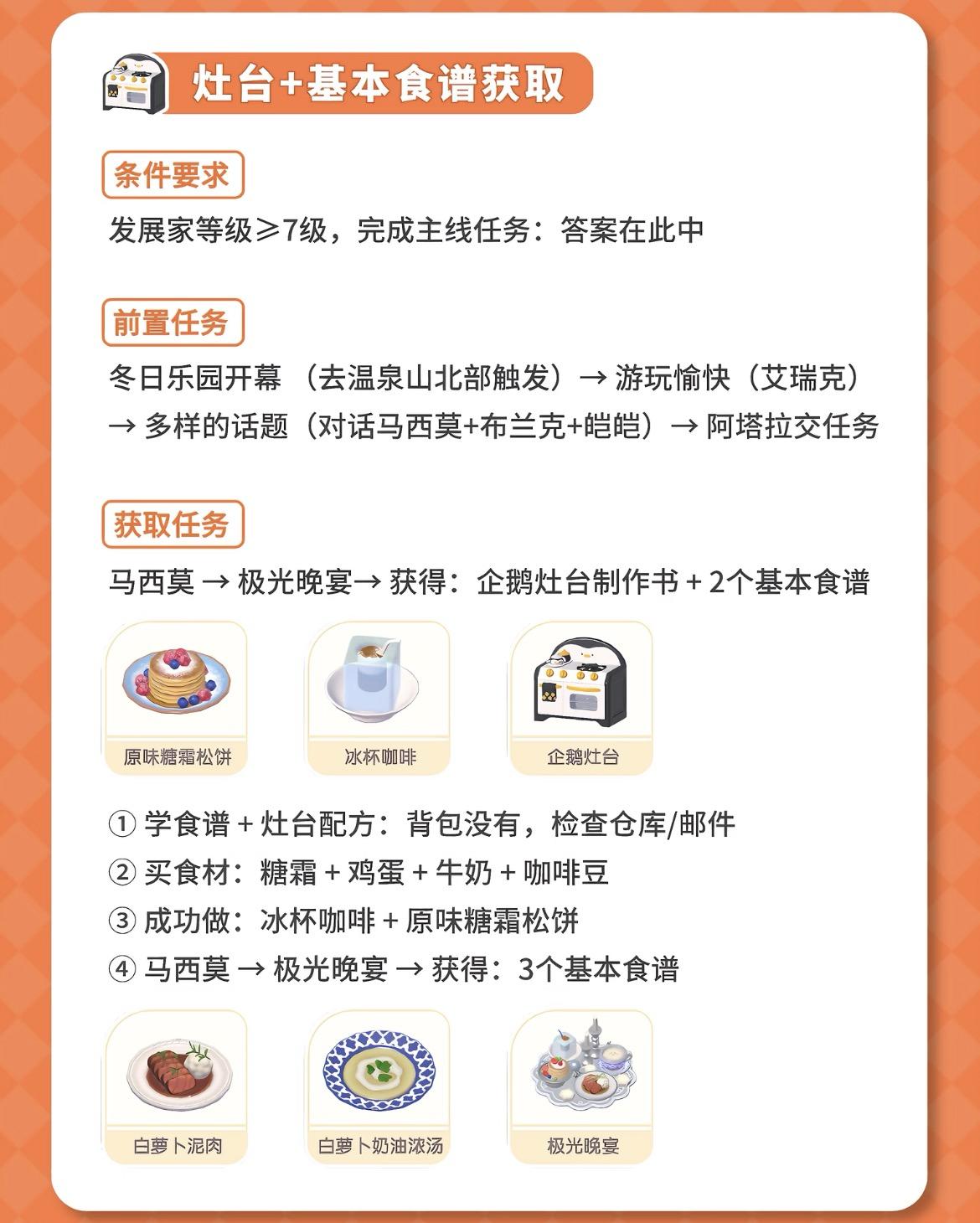 心动小镇冰雪潮流季1.31正式开始!一、上线就会接到镇长电话,传送到温泉山;然后去找马西莫领取任务,共2次任务(完成送食谱和企鹅灶台);再回到家园找工匠台直接制作出来。图1二、马西莫烹饪商店:购买限定食材(糖霜);布兰克的园艺商店:购买限定白萝卜种子(限定花卉种子要等第二周上架);安妮音乐商店:新增空灵鼓。图2三、潮流季限定食谱:1.冰杯咖啡食谱(隐藏食谱:冰杯拿铁),如图3;2.白萝卜