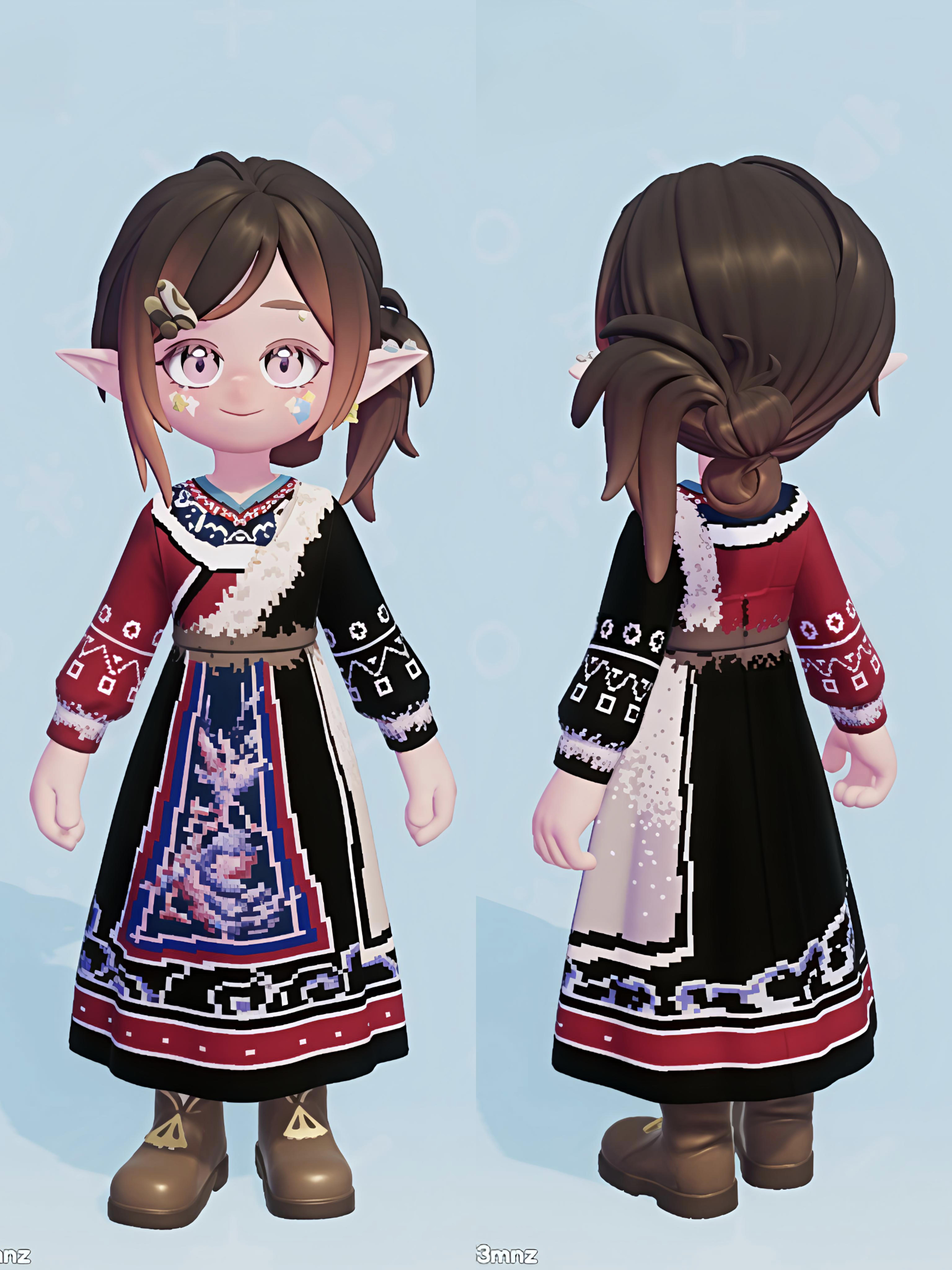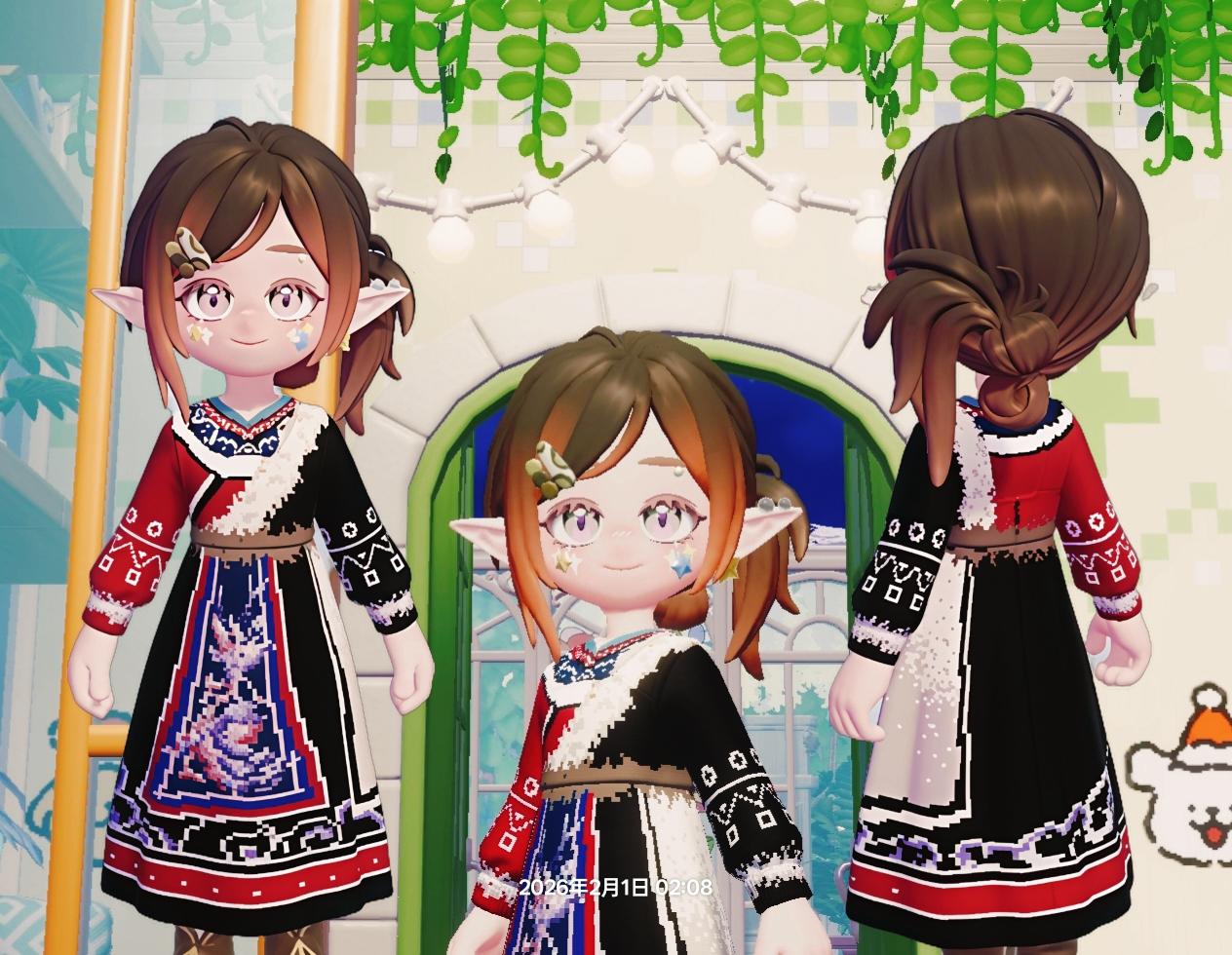 这套服饰以藏族传统氆氇织物为核心灵感,白底为底,用像素化织纹还原了藏袍纹样的粗犷肌理与宗教符号的神秘质感。领口的黑色镶边与腰间的红金系带,复刻了藏装的华贵细节,流动的纹样仿佛将青藏高原的经幡猎猎与神山圣湖的辽阔织入衣料。设计紧扣“域风织彩”主题,让藏地的文化温度成为小镇角色可穿戴的高原印记。#心动小镇域风织彩