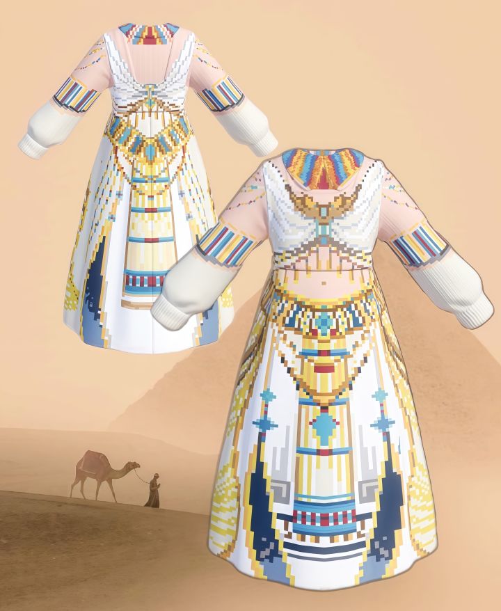 这套服饰以古埃及神庙壁画与法老服饰为灵感,以沙金、石白为主色调,像素化织纹还原了壁画中圣甲虫、几何图腾的神秘肌理。裙身的蓝黄渐变模拟尼罗河的波光,领口的彩色织带复刻了祭司服饰的华贵细节。设计紧扣“域风织彩”主题,将古埃及对太阳与尼罗河的崇拜织入衣料#心动小镇域风织彩