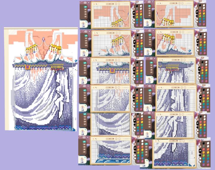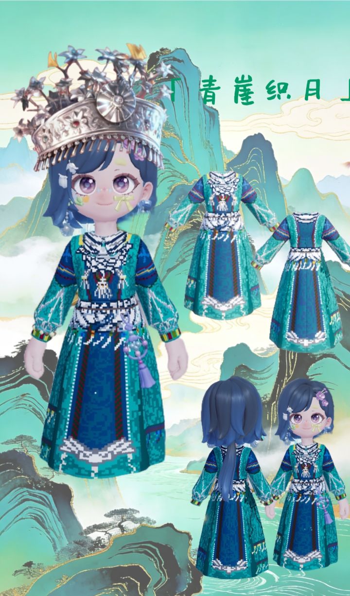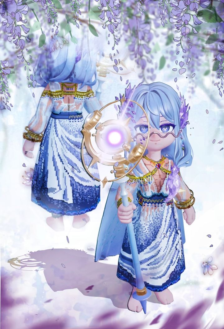 此作品为烬月祭衣。紫藤花下燃烬的月光和魔法杖交织的神秘祭祀,运用蓝紫色调,领口与袖口上添加了独特的异域风装饰,通过层层叠叠的衣襟配饰展现独特的异域风情。格子图已附,喜欢的宝宝可以投一票自取格子图#心动小镇域风织彩