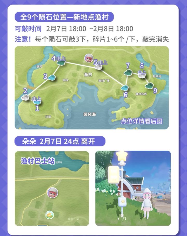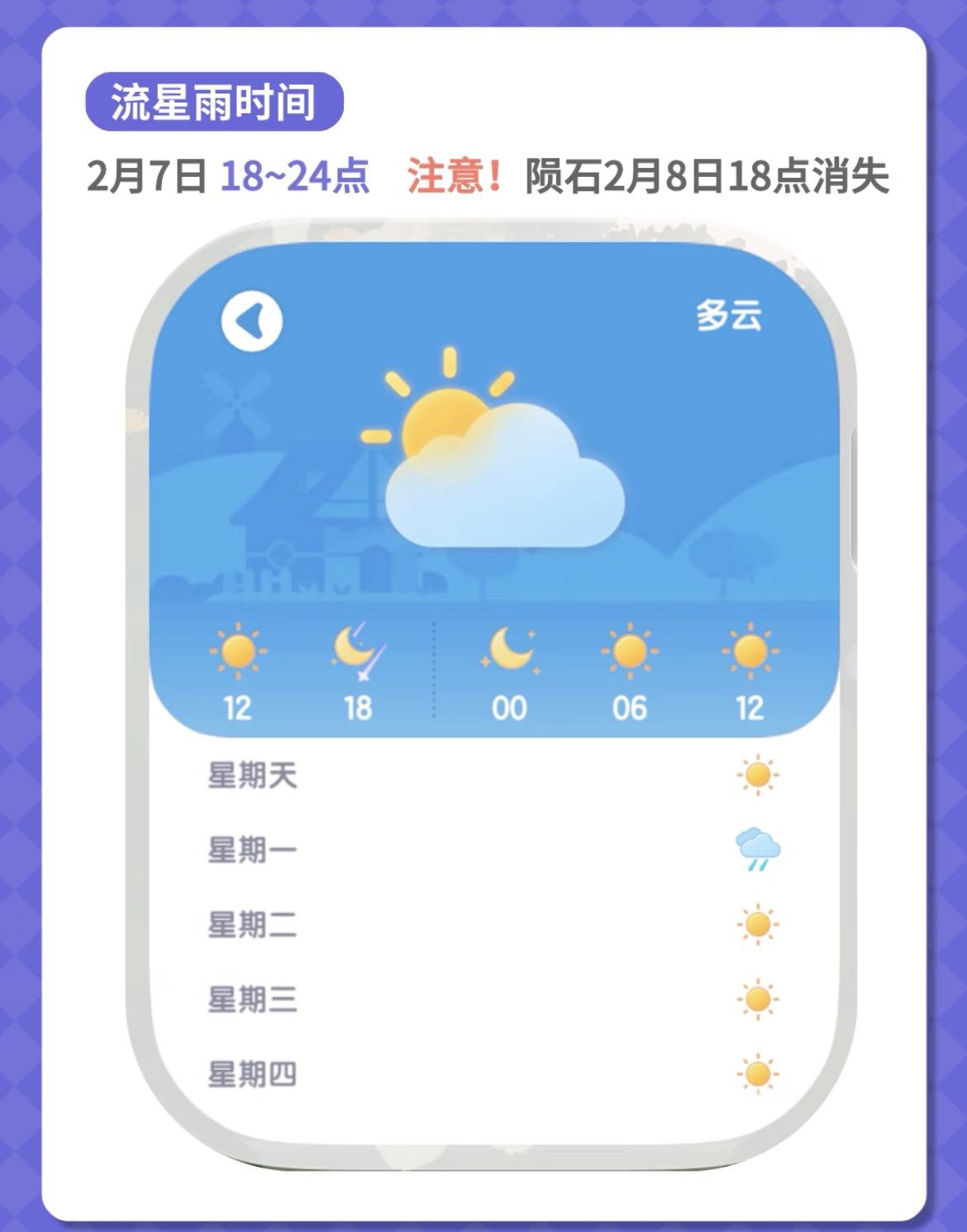 今晚18点必看!9个陨石新位置+朵朵商店兑换指南,速薅限定星座家具!今晚(2月7日)18:00~24:00,小镇将迎来绝美流星雨天气!本次活动持续至明晚18点,所有陨石可停留24小时。如果你也想轻松集齐星陨碎片、兑换限定星座家具,就快收下这份新鲜出炉的全攻略吧!一、基础玩法三步走1. 找陨石:流星雨期间,前往温泉山区域,寻找随机坠落的9颗彩色陨石。2. 敲碎片:每颗陨石可敲击3次,每次获得