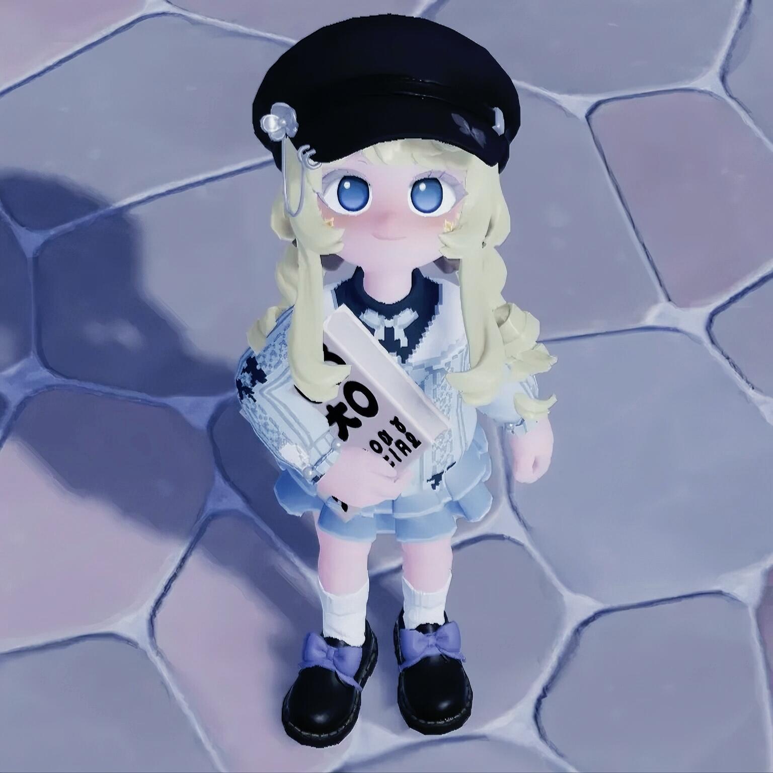 #心动小镇域风织彩 “家人们谁懂啊!我在心动小镇里肝了好久的域风织彩主题时装终于做出来了!就想做一套清爽又带点复古感的衣服,所以选了这个像小镇清晨雾蒙蒙的浅蓝,又在毛衣上加了点异域风的小纹路。配上报童帽和小短裙,再抱本书,走在石板路上感觉自己就是心动小镇里最靓的小报童!真的太喜欢啦!”