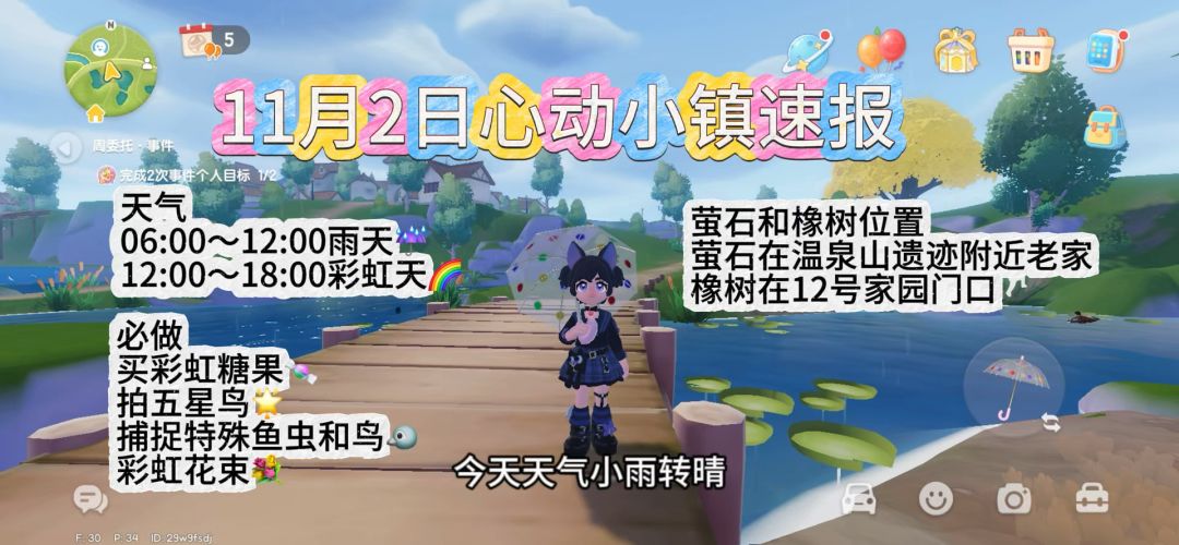 天气🌈 6:00~12:00小雨🌧️ 12:00~18:00彩虹天🌈 萤石橡树位置 萤石:温泉山遗迹 橡树:12号家园门口 特殊天气必做📒 拍五星鸟 抓特殊天气虫鸟鱼 彩虹花束 彩虹糖购买 #心动小镇 #心动小镇攻略 #心动小镇攻略征集 #心动小镇创作家激励计划 #游戏日常