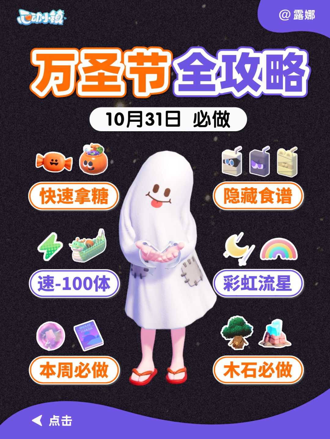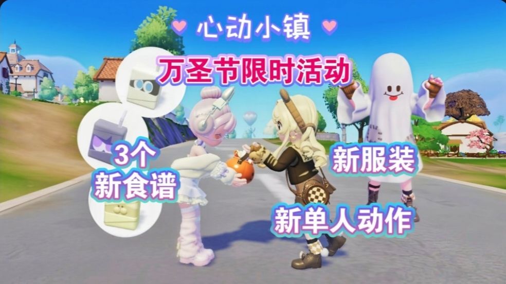 10月31日至11月17日,开启万圣节【不给糖就捣蛋】限时活动。 玩法攻略、2套新服装、3个新食谱、宠物装扮,家具摆件,新单人动作。 #心动小镇 #心动小镇陇上金颂 #小镇庆典陇上金颂 #心动小镇攻略 #心动小镇日常